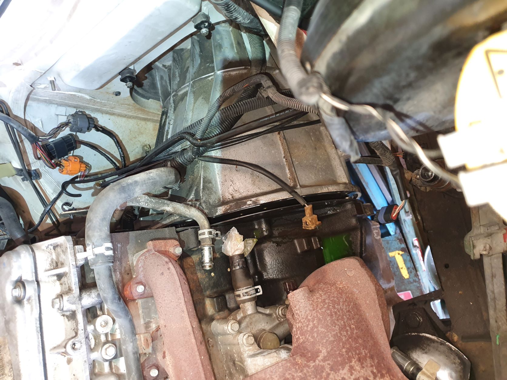 Ensuite j'ai bien galérer pour défaire la partie leviers, capuchons, isolant, renvoie de BT côté intérieur du def... Ensuite les 8 vis de cloche sont retirées. Des connecteurs par-ci par là, des masses. Faut bien regarder!