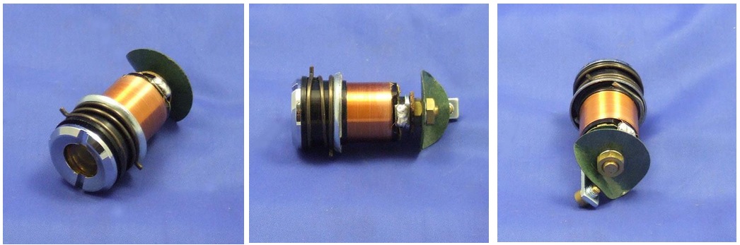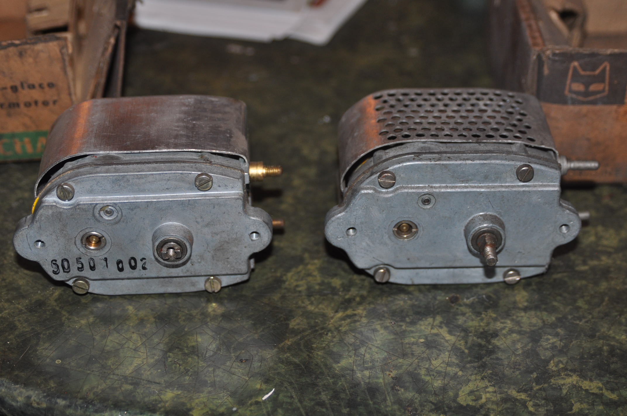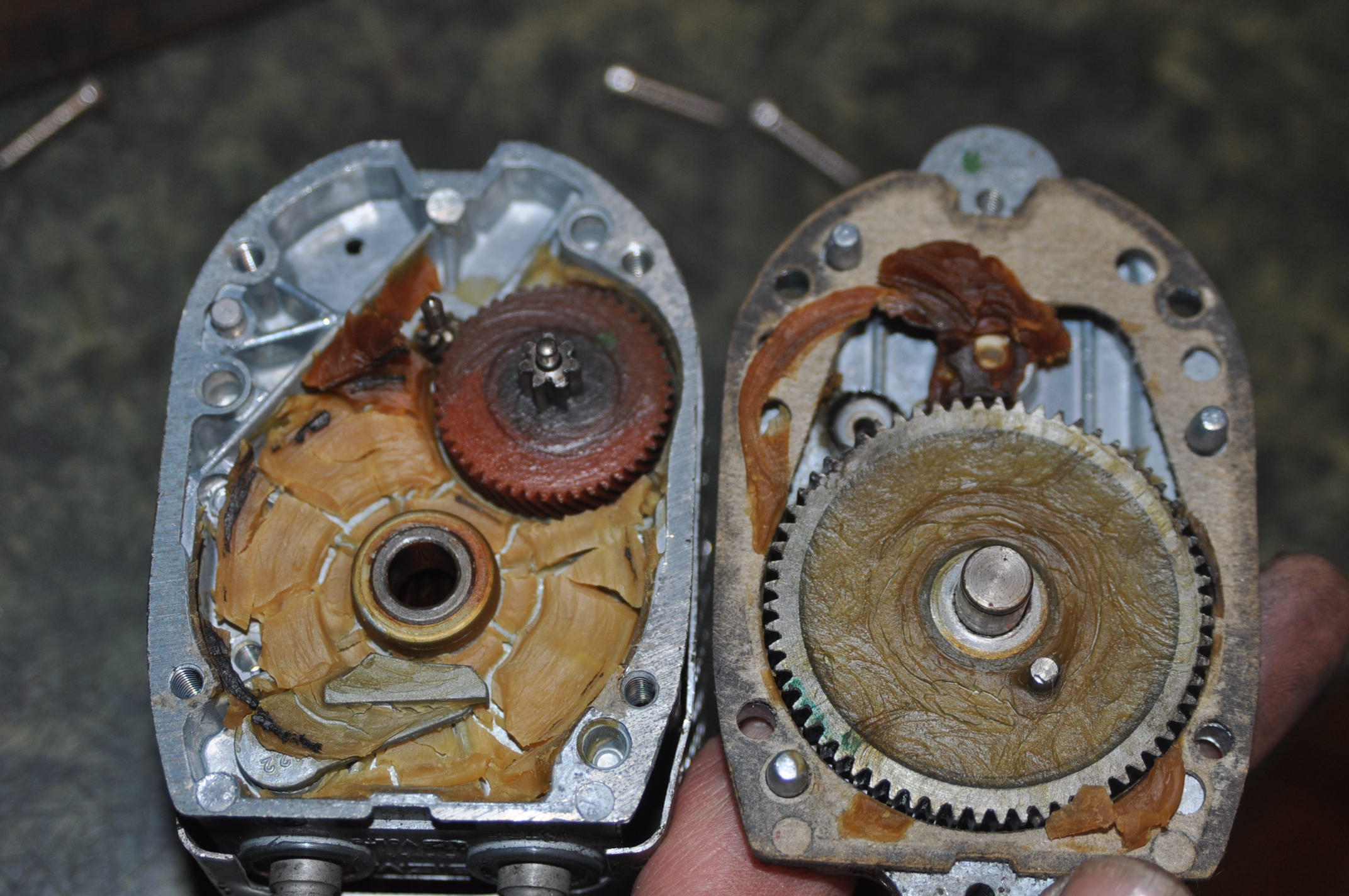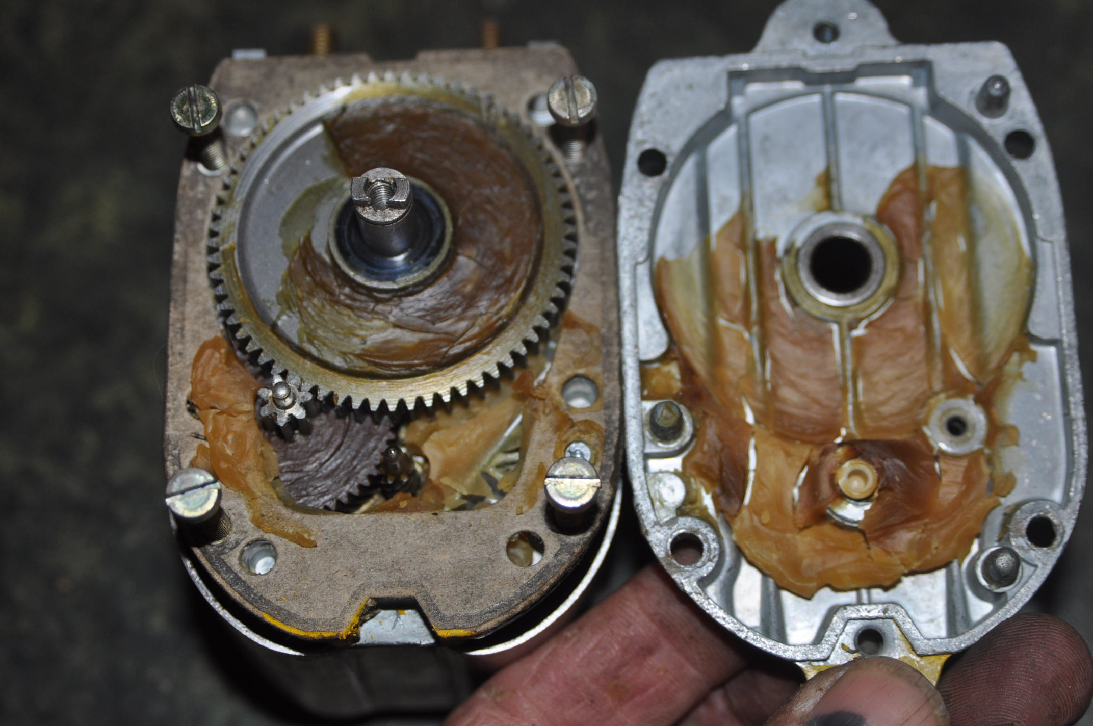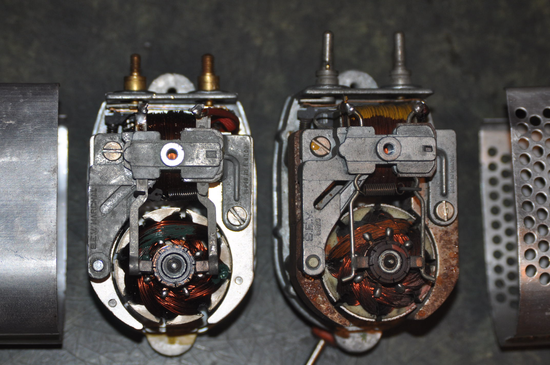 Un en 6V: broche rouge le +6V; la verte le + après contact pour le fin de course; la masse = la carcasse; branchements vissés. Axe de sortie. Aspect du capot. Il a l'air neuf, je l'ai testé, il fallait que je le secoue pour qu'il tourne et de temps en temps il s'arrête. Je l'ai ouvert pour voir, la graisse à l’intérieur est sèche. La fonction fin de course est opérationnelle. En 12V, même branchement sauf que là ce sont des cosses rondes, axe de sortie différent du de celui du 6V; moteur testé OK, neuf? Mais propre. Les deux cote à cote pour comparaison: La technologie de mise en contact des charbons est particulièrement intéressante... Bon OK j’arrête là pour revenir sur terre