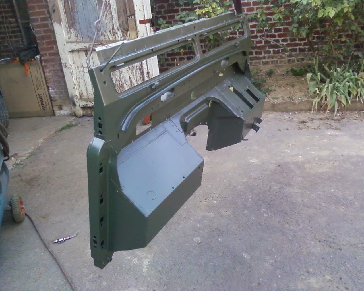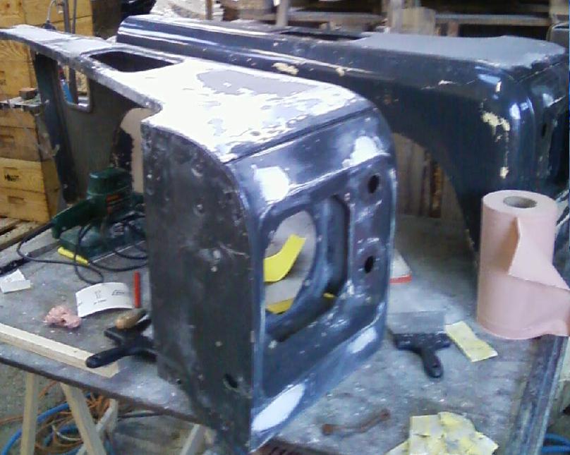 Les portes avant sont pretes a peindres, et la je pofine les ailes! J'ai sablé les wolf, les parties du tablier rouillées, les supports de caisse, la caisse, bref un peut de tout ce qui traine et qui est rouillé ou oxider (alu) et ensuite, deux couche d'apret, Puis deux couches de vert (j'avais demander du coniston green, et il on pas reussi a me la faire tout a fait pareil!) ou deux couches de noir! J'ai aussi reposer le chassis sur ses ponts, Et l'ensemble moteur boites par dessus! La je refléchi a mettre ou pas un essui glace arrière (j'ai celui du disco, a adapter si besoin!), je répare les faisceau et les accordent(faisceau moteur et boites du disco et le reste du def)