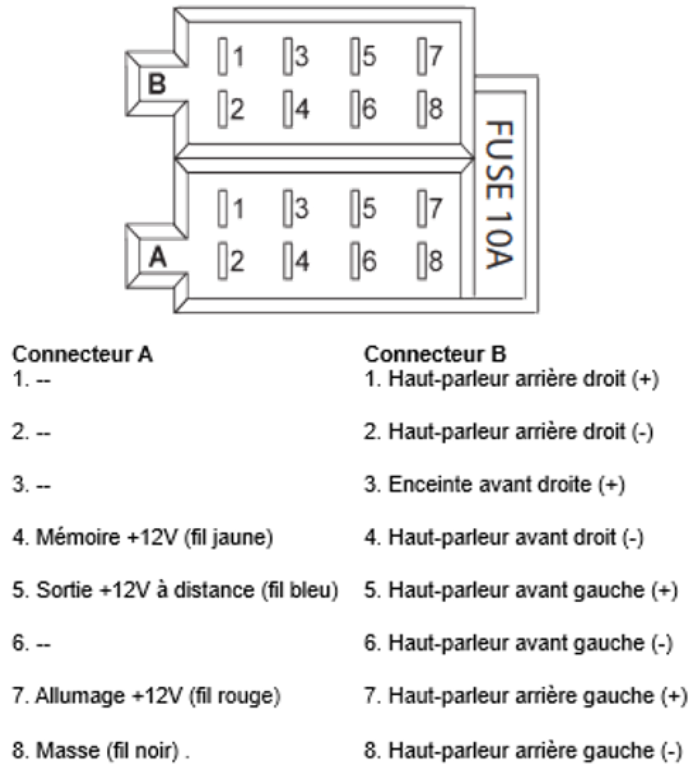 La réponse tient dans le fait qu'on peut brancher un amplificateur asservi à l'alimentation de l'autoradio ..... Donc, je vais isoler cette sortie pour éviter tout accident.A ma question : sur le point 5 du connecteur A, la sortie + 12V à distance (fil bleu) est-elle bien celle du kit main libre en Bluetooth ? Donc, en + après contact, comme l'alimentation du point 7 ?