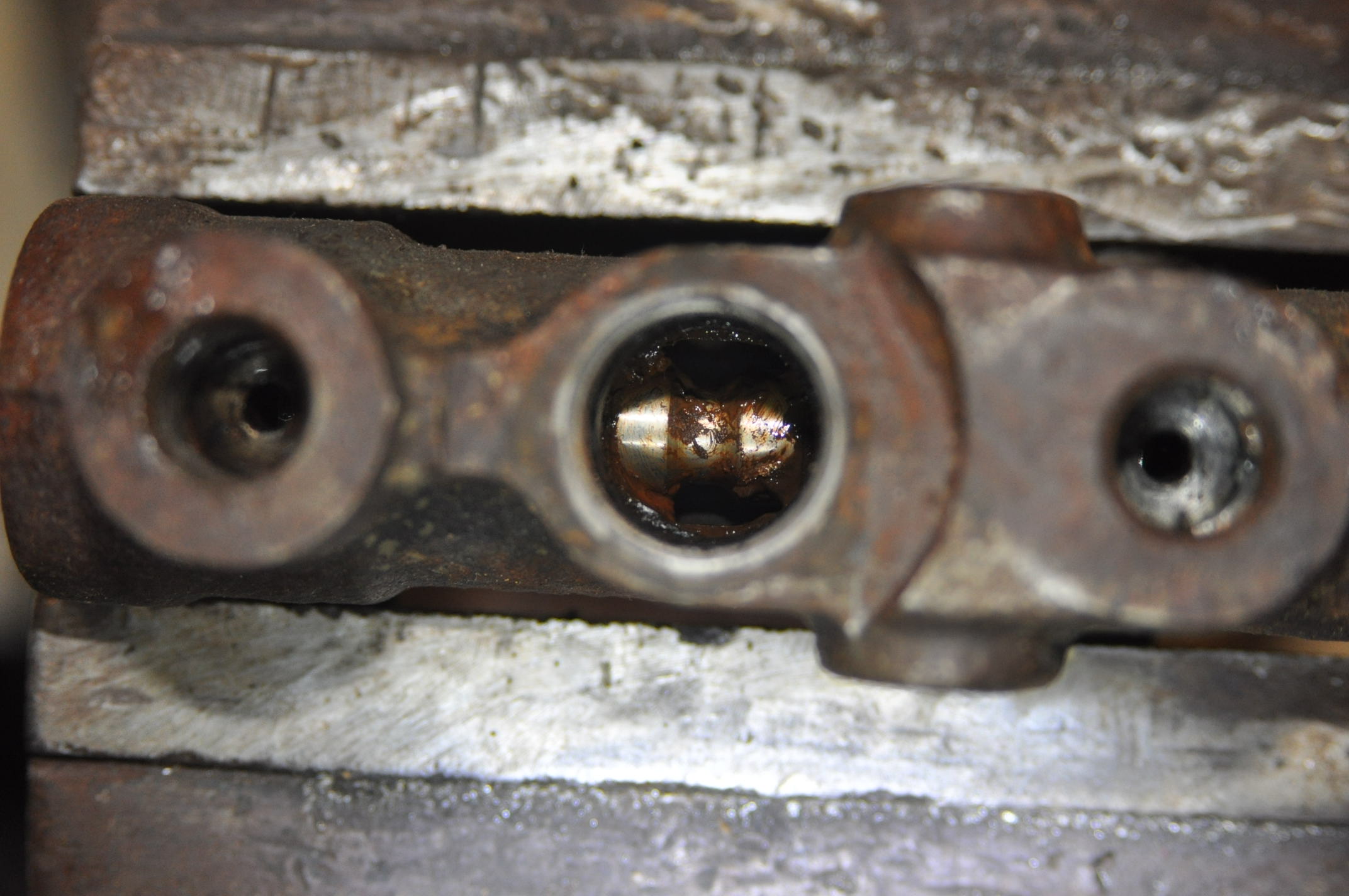 Le piston et le contacteur en position repos: On aperçois par le trou du capteur, le piston en position repos, ou a l'équilibre des pressions dans le circuit avant et arrière, l'encoche centrale est au centre. En position déséquilibré avec fuite sur le circuit avant, donc le piston se déplace vers le cotè où il y a le moins de pression. Cela a pour effet d'établir le contact qui va provoqué l'allumage du voyant. Donc, titi il faudrait contrôler que le circuit du voyant fonctionne correctement c'est à dire que le voyant de frein s'allume si tu fais la liaison avec un petit bout de fil.torero a écrit : Normalement, tu dois avoir un dispositif avec un piston alimenté par le circuit avant d'un côté et le circuit arrière de l'autre côté. En cas de fuite sur un circuit, le déséquilibre de pression fera déplacer le piston qui actionne alors un contacteur pour allumer un voyant au tableau de bord.