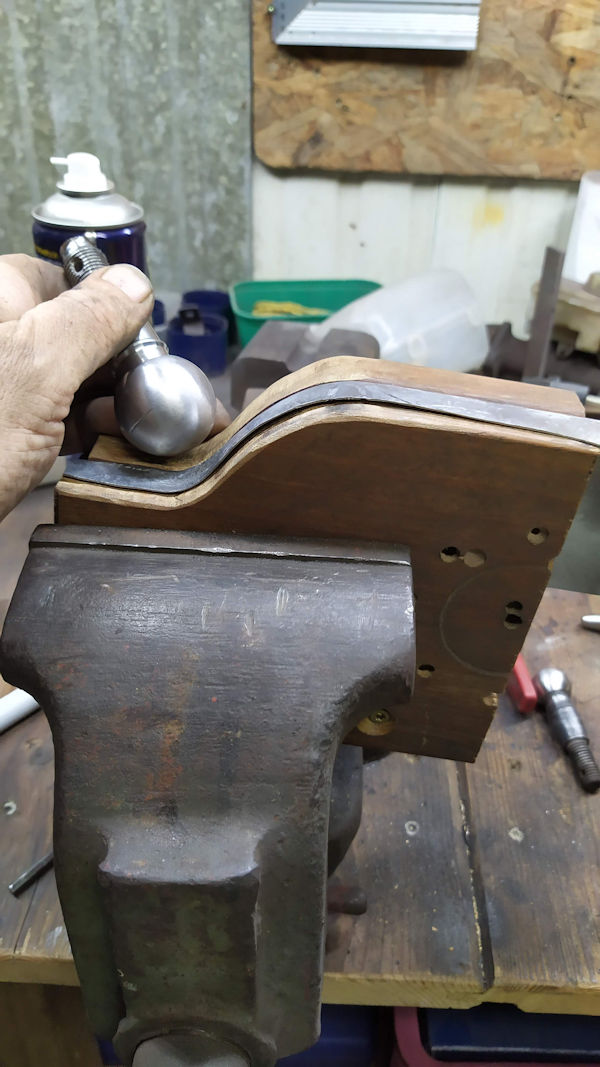Je sors la plaque de la pince en bois et continue sur mon tas. J'arrive à faire le congé mais évidemment le plan principal se gauchit. J'arrive à rattraper en partie mon affaire Je replace la tôle dans la pince en bois, je sacrifie une rotule sur l'autel de la carrosserie et je m'en sors assez honorablement. La sphère de la rotule permet de bien aller étirer la tôle dans le creux du congé. Je me demande si je les laisse comme ça ou si je les monte en marteau. A voir... à suivre...