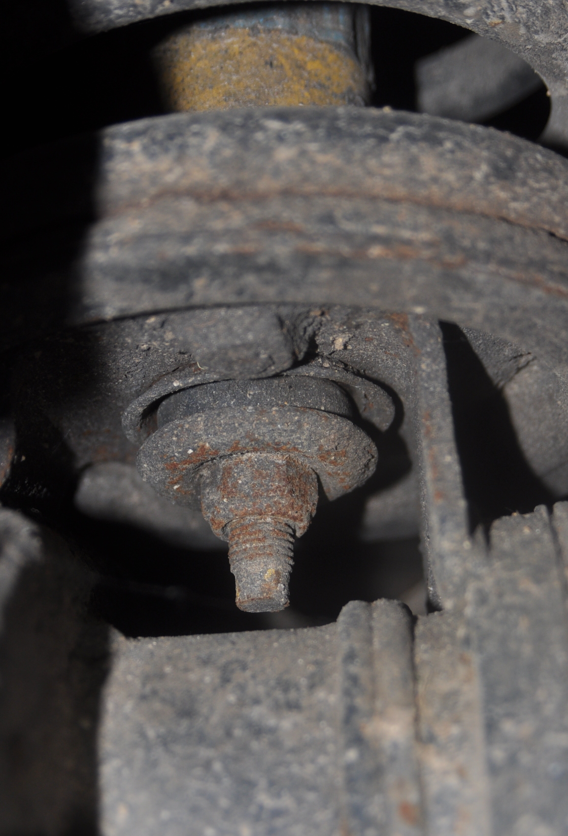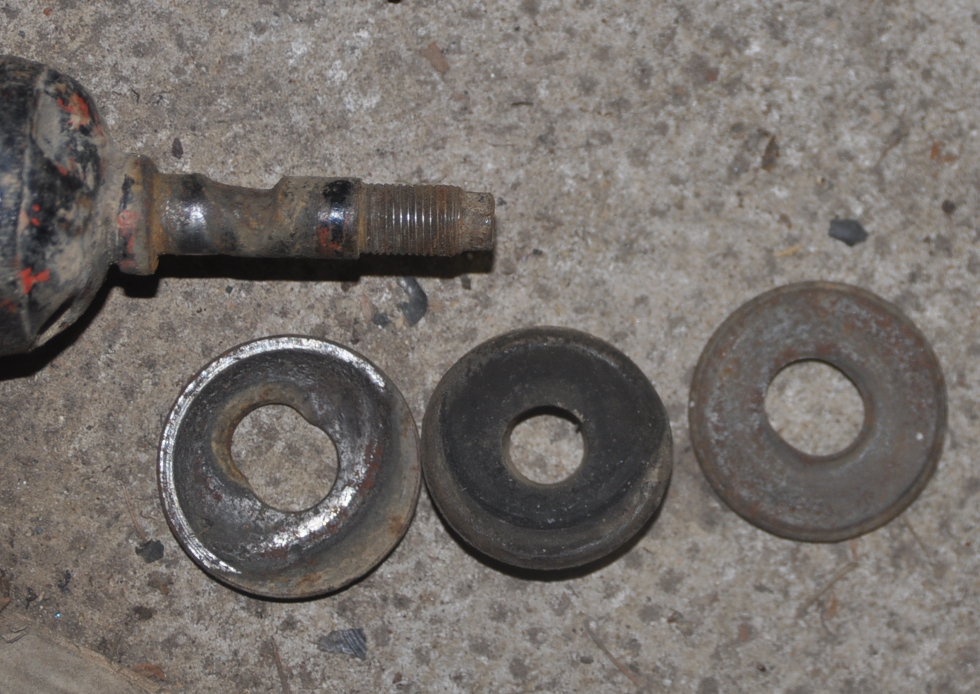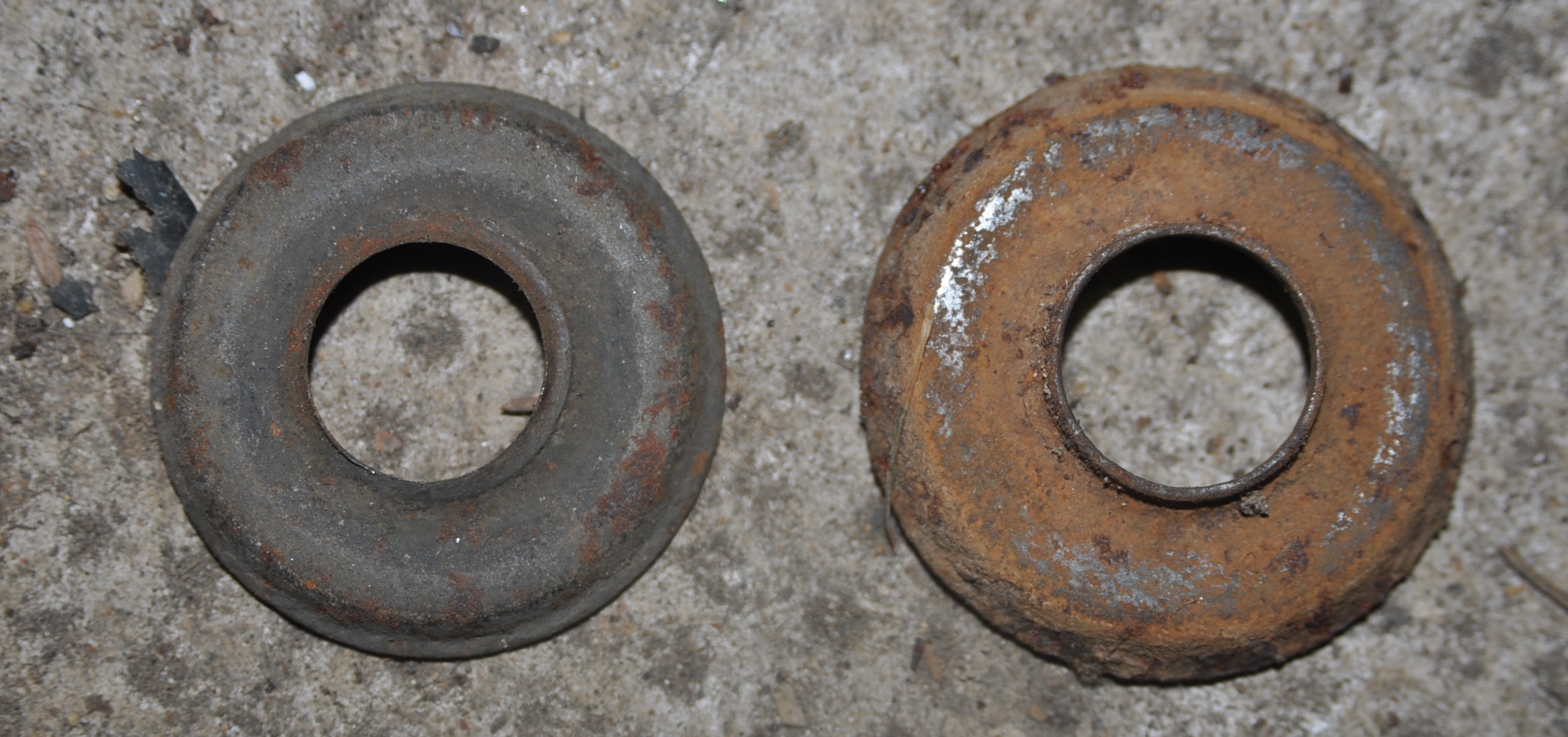 on se demandait si ces rondelles (à mon sens indispensables pour centrer les silent-blocs et éviter que la tige de l'amortisseur ne tape en permanence contre la tôle du pont) ne sont pas simplement soudées sur le pont des TD4, comme c'est le cas sur de nombreuses voitures?