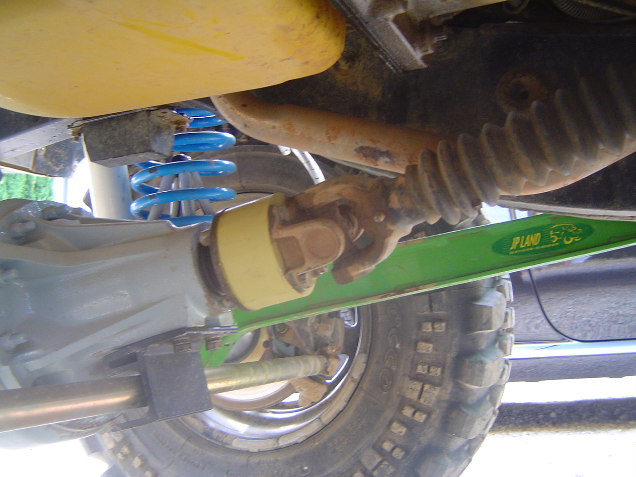 Pour apporter un peu d'eau à notre moulin, j'ai fait une adaptation d'un arbre double croisillons de td5 (origine Scorpion Racing) sur mon 110 atmo modifié en V8. La rehausse doit être entre plus 12 et plus 15 cm donc gros angle de travail, et l'arbre était trop court de 5 cm.J'ai donc fabriqué une entretoise côté pont de 5 cm et bien sûr il m'a aussi été nécessaire de remplacer la tulipe de sotie BT avant.