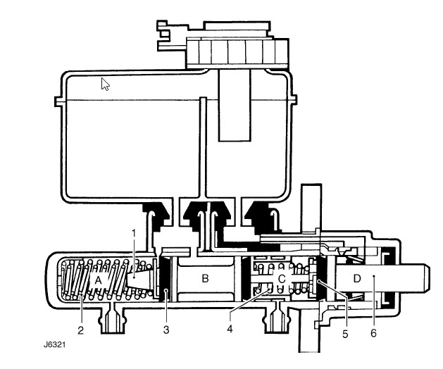 Cette coupe est intéressante pour comprendre , le réservoir comporte deux parties séparées pas un seuil . cela sert-il à laisser d'éventuelles bulles disparaitre ? je ne comprend pas bien les cycles dans le corps du frein des sections A;B;C;D . Les sections A et C sont les zones de compression et les autres ?