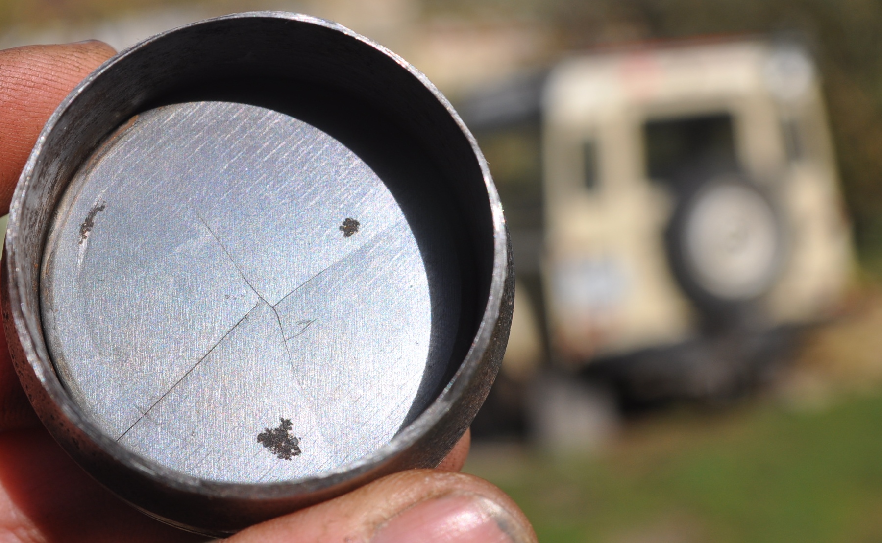 Amortisseur d'embrayage, STD10002 spécifique au disco fait environ 5cm de diamètre et 2.5cm de haut. Dedans, il n'y a presque rien, donc entre 75€ et 100€ pour rien et encore pas chez LR, cela me fend le cœur : Mais dans l'histoire, il n'y a pas que mon cœur qui se fend, mais également la membrane amortisseur : Cette membre est métallique et fait environ 1.63mm d'épaisseur, pour 43.5mm de diamètre : Il y a l'espèce de jonc, qui sert de cale de décalage, de sorte que la membrane n'appuie pas au fond du logement et peut donc se "gonfler", bien que je pense que la majorité de l'augmentation du volume de la chambre, se fasse plus sur l'épaisseur du joint torique: Puis la membrane, et le couvercle avec son joint torique qui réalise l’étanchéité avec l'entrée et la sortie du liquide de frein. Le couvercle étant solidement sertie dans la douille. Donc les pannes les plus fréquentes: