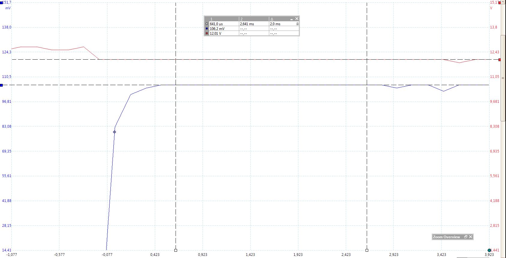 Ce qui permet d’appliquer la loi d’Ohm aux deux millièmes de secondes (2 ms) suivant la mise sous tension des bougies qui, bien évidemment, seront toujours froides au bout d’un temps si court. L’intervalle de temps séparant les deux règles verticales délimitant le calcul est de 2 ms, l’intensité de 106,2 A (il s’agit des données brutes de la pince ampèremétrique, qui sort 1 mV/A) et la f.é.m de 12,01 V.