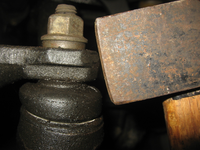 8 ) Mettre une pression écartante, ici à l'aide d'un tube puis taper un bon coup sec avec une massette de 1,5 kg sur la biellette pendante. Sans taper ni le filetage, ni le soufflet en caoutchouc de protection. Revoir la photo de la position du coup de du marteau
