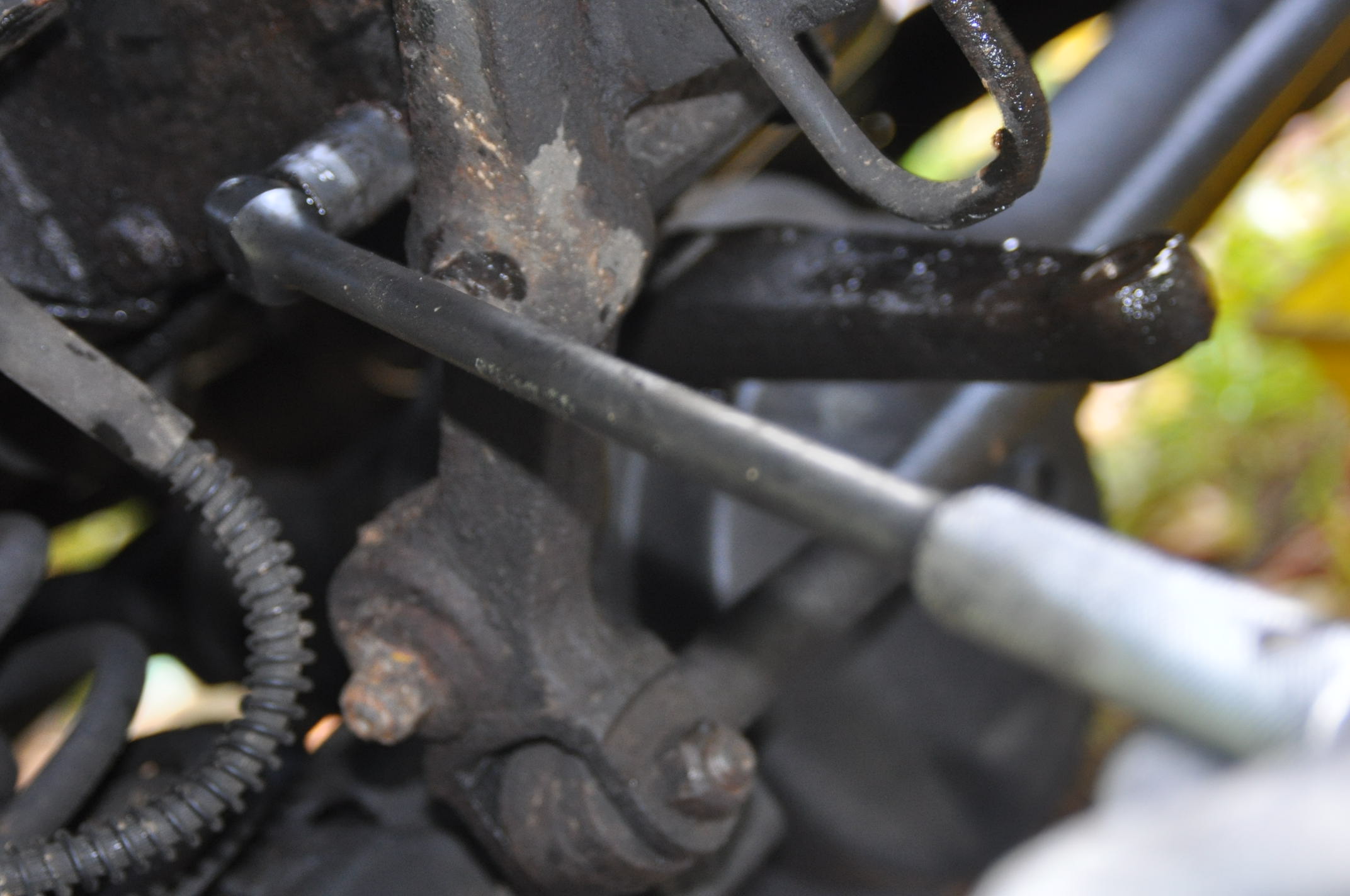11) Voila, maintenant que le boitier de DA est par terre, tu peux voir la barre de raccordement courbé forgé sur le boitier de DA avec son écrou et sa rondelle.