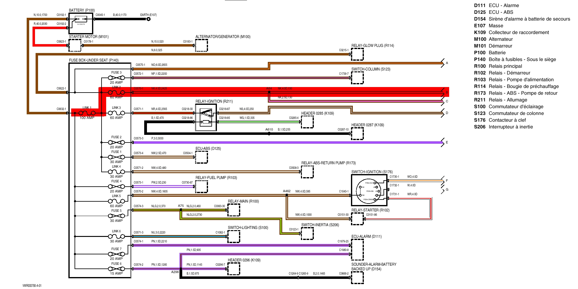 Car comme tu peux le voir sur le schéma, le fusible de 100 A dessert un tas de chose dont le fil violet a travers le fusible 1 de 30 A. Donc enlève tous ces fusibles puis remet un fusible de 100 A puis remet les fusisible un par un et vois celui qui fait sauter le 100 A. Première remarque, les fusible repérés FUSELINK sont vissé à l'aide de deux vis cruciformes. Deuxième remarque, je suis étonné que le fusible de 100 A saute avant l'un des fusibles qui le suit, peut-être un cumule de plusieurs défauts. Le schèma est extrait du thème :Problèmes électriques suite inversion batterie Defender