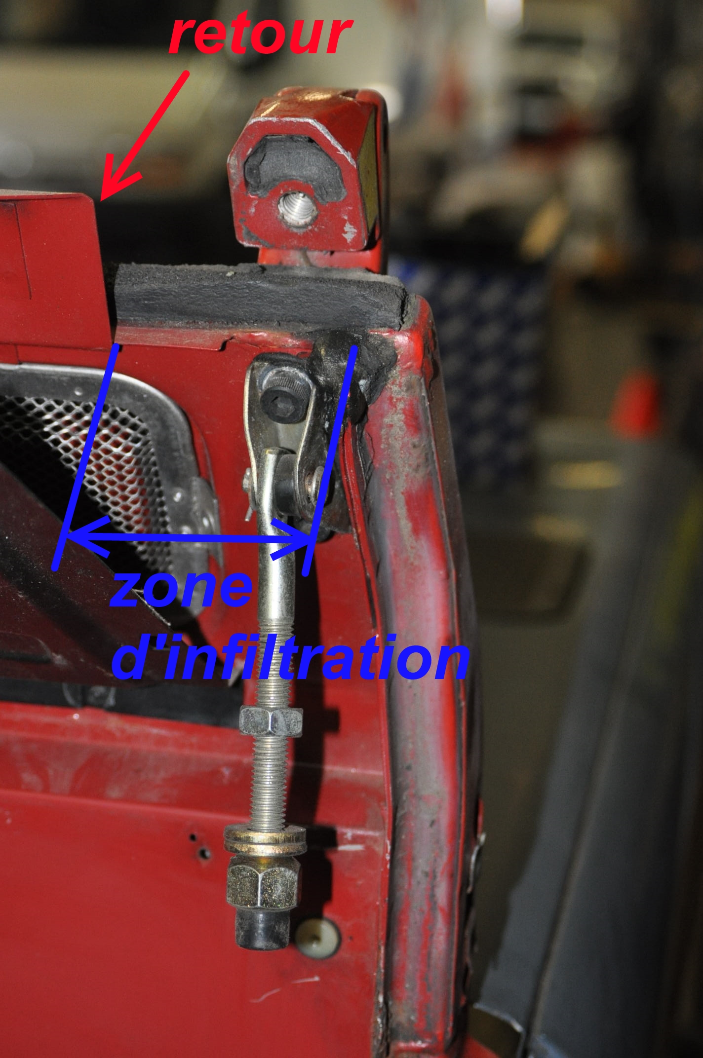 photo 6 en début du sujet, comme tu peux le voir, il y a un retour sur le tablier, qui fait que l'eau ne peut pas s'écouler à l’intérieur au niveau des flèches vertes, mais que celle ci va pouvoir pénétrer dans l'habitacle à partir des flèches rouges, là où le retour s’arrête.