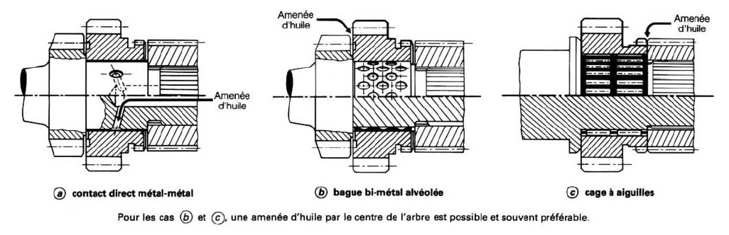 - un élément de frottement interposé : bague bi-métal (alvéolée ou non) ou une cage à aiguilles.
