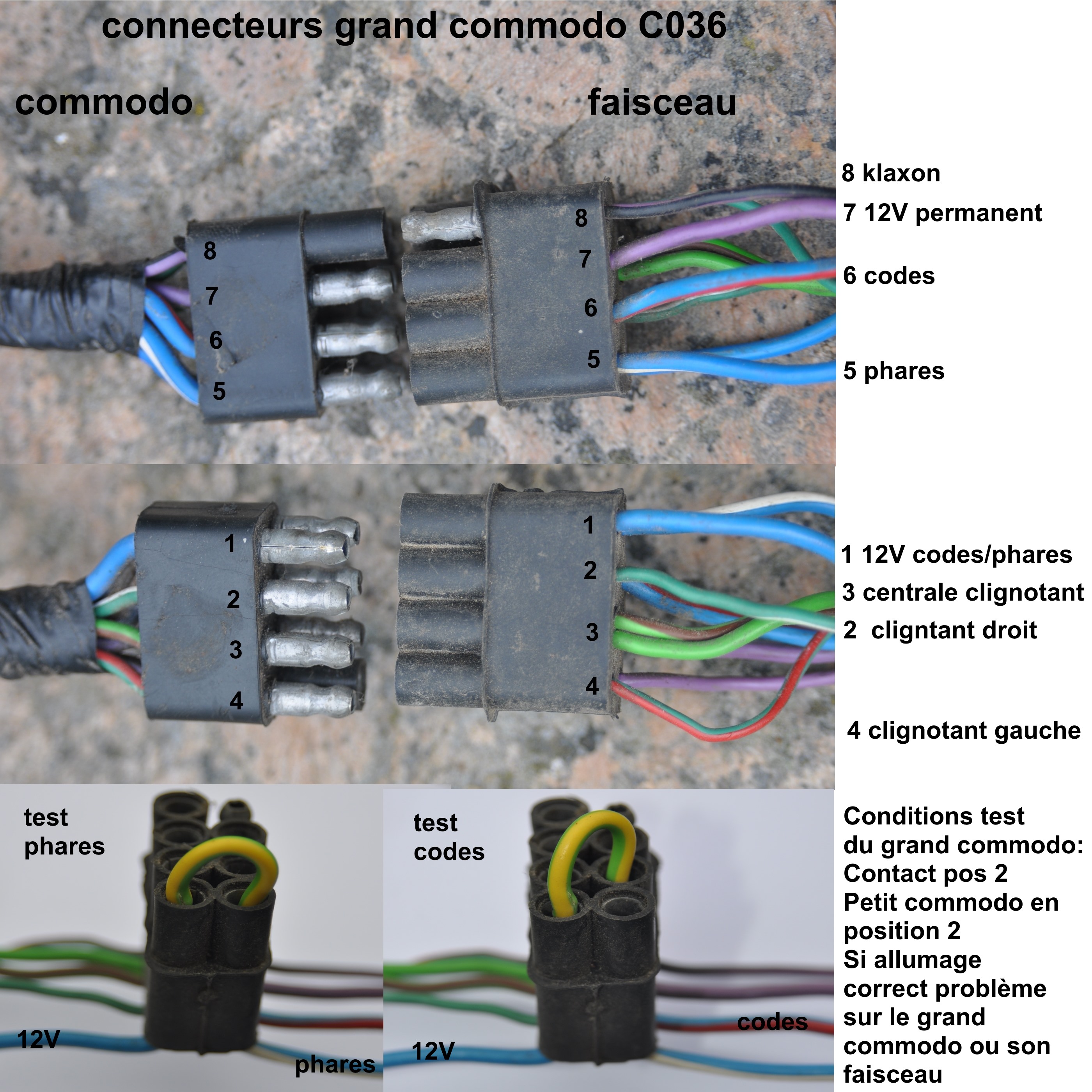 Vérifie les départs vers les code et les phares. Contrôle bien le sertissage des plots male sur les languettes et éventuellement, met un peu de soudure entre le plot male et sa languette cuivre