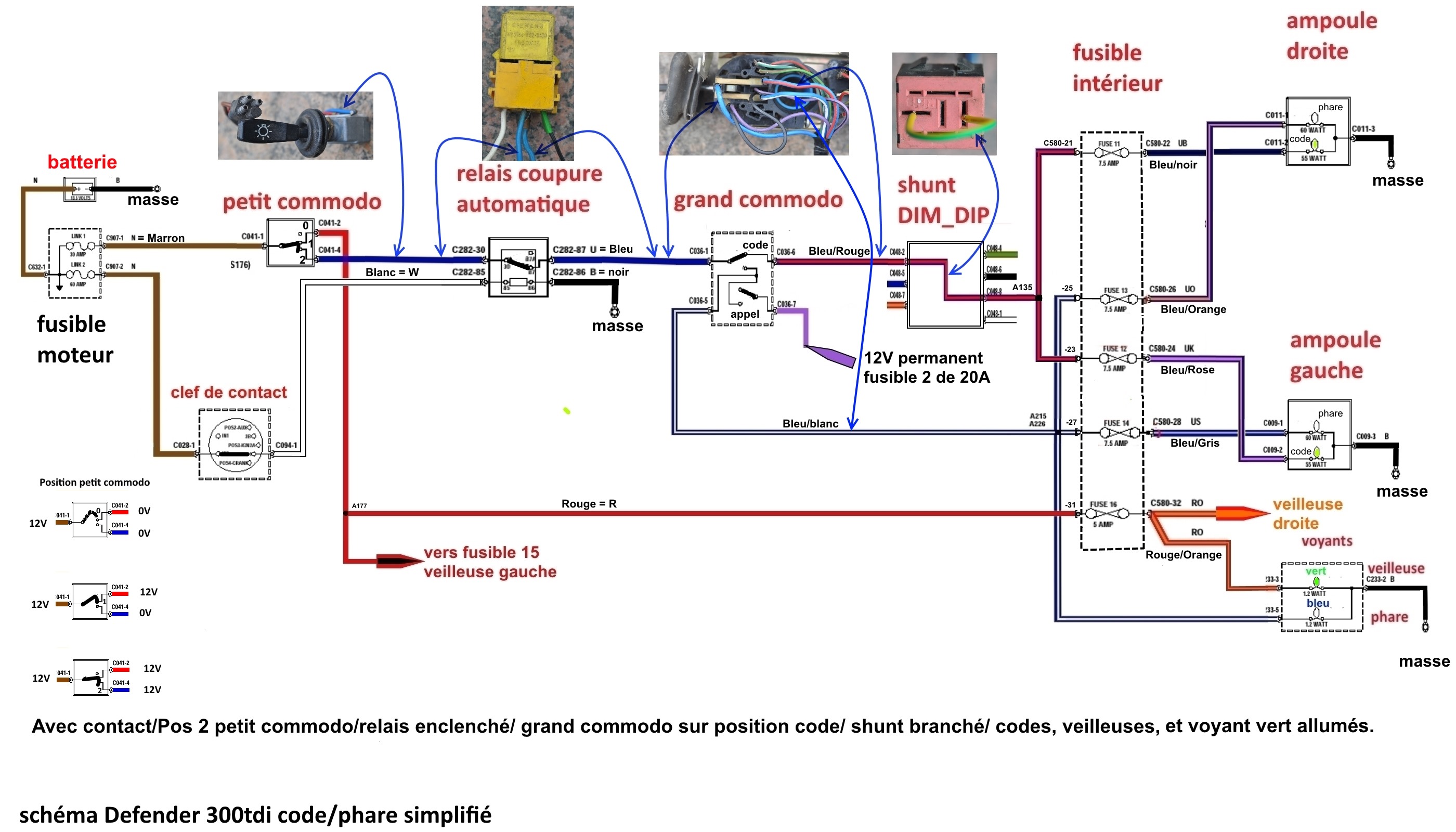 L'arrivé du fil bleu, lui aussi peut déconner, car ce qui est bizarre, c'est que cela fonction en phare moteur tournant et pas moteur arrêté, avec le contact.