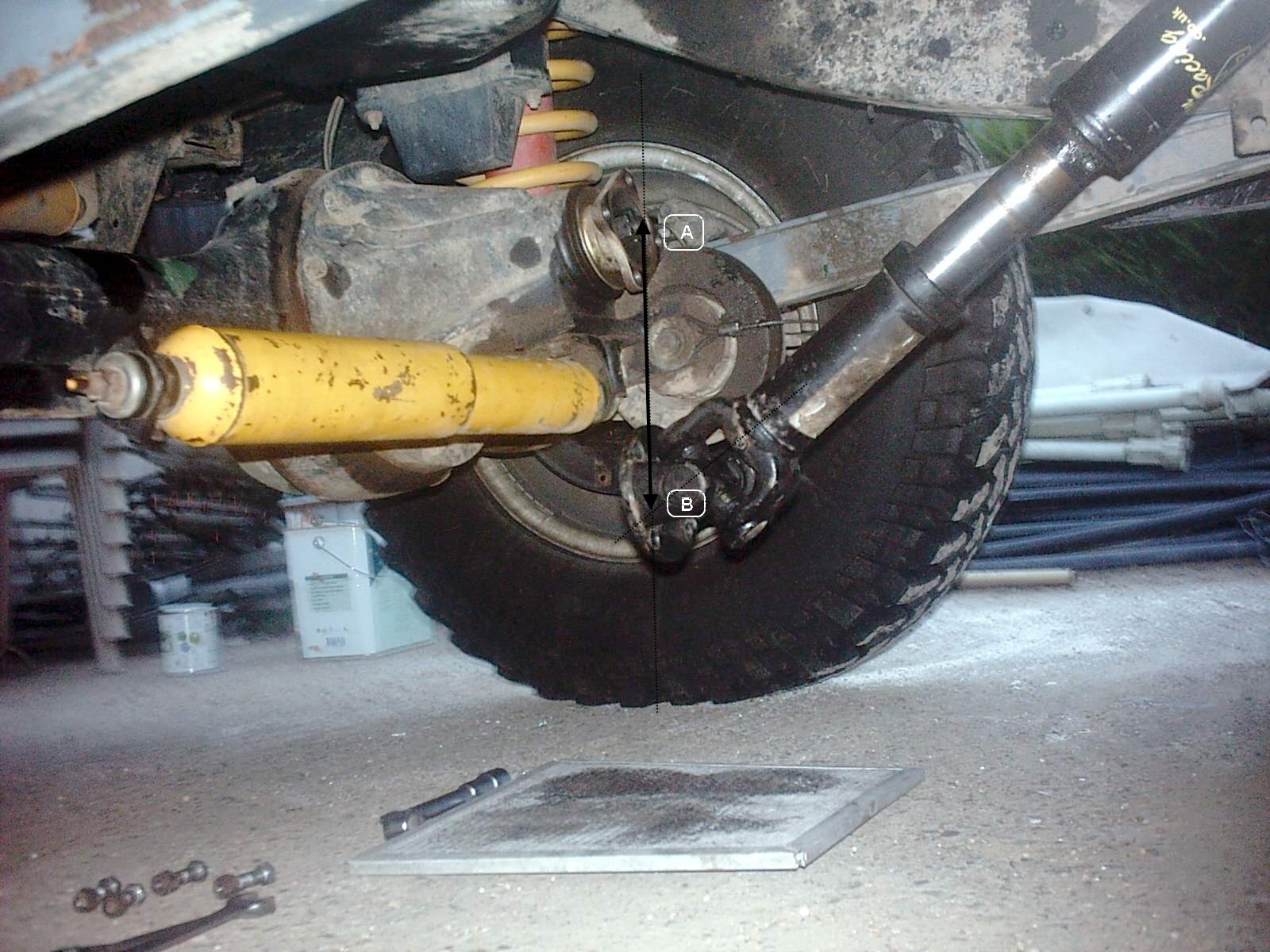 (-) 2 à 3cm, coté PONT av, effectuée angulairement parlant par l'arbre de transmission av devant-être, par simple esprit de bon sens, supérieure ou au pire égale à celle en détente max des amortisseurs av utilisés..........enfin pour moi....