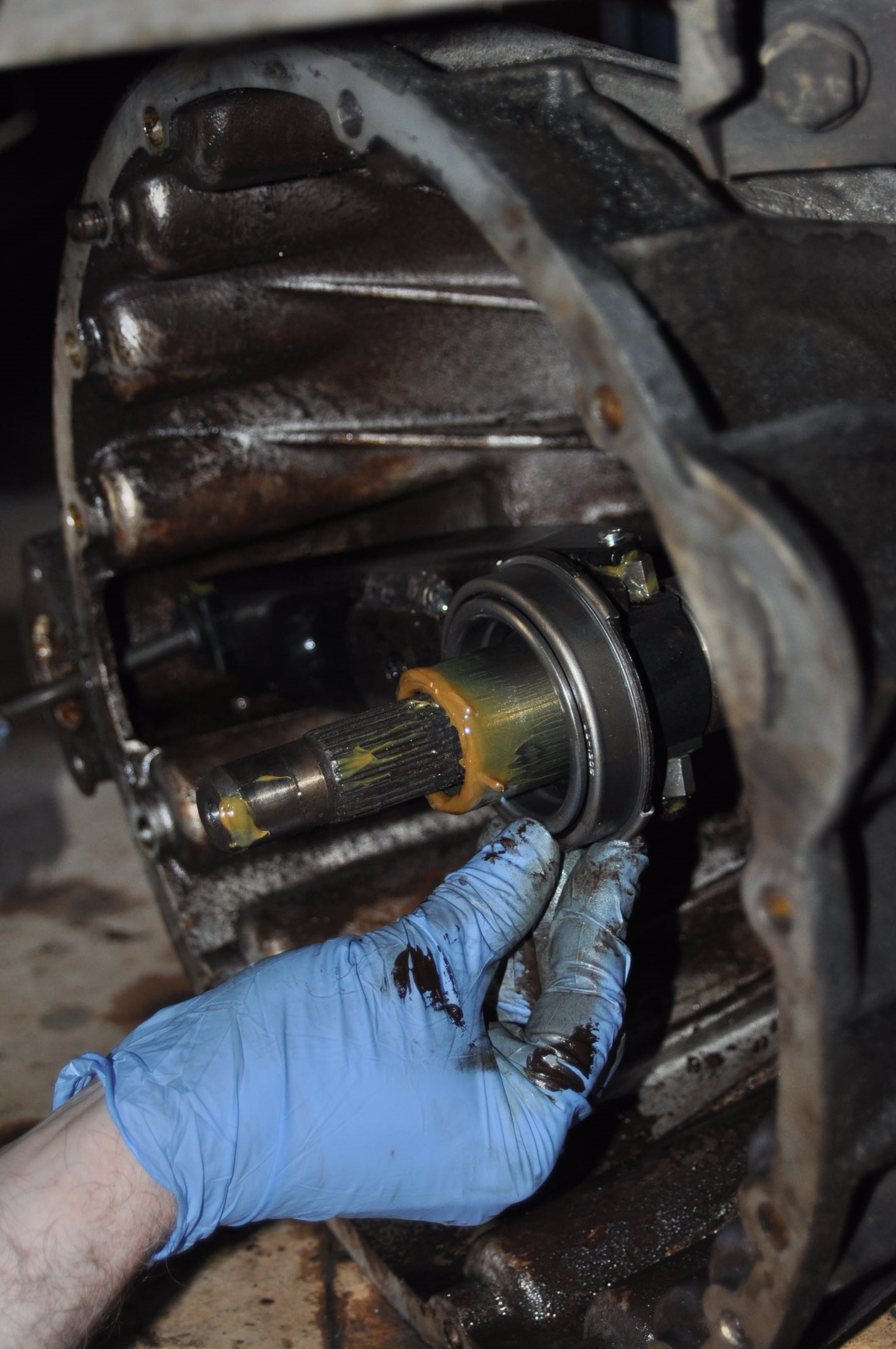 Présentation et positionnement d'une pièce maitresse du système, notez aux marques laissées dans la graisse, que la greffe s'est faite sans hésitation aucune, pile poile face aux logements des patins. Remarquez, la remarquable coordination du mouvement entre la main gauche et la main droite, permettant cette mise en place sans faille en centrant la fourchette d'une main gauche au centième près pour introduire les patins dans leur position, et là... le terme admiratif est bien faible ils n'ont toujours pas bougé d'un millimètre.
