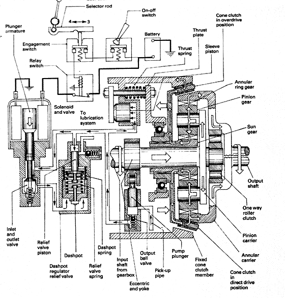 Un overdrive remplace ce pignon d'entrée, il a un 'tube' qui prend le mouvement de l'arbre de BV, et un pignon qui entraine la BT qui peuvent tourner indépendamment l'un de l'autre, contrairement au pignon d'origine, et soit l'arbre de BV entraine en direct ce pignon, soit le mouvement va faire un tour dans l'overdrive pour revenir 'modifié' au pignon...