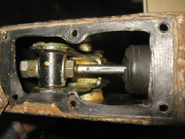 8 ) trappe ouverte, pédale appuyée. Les deux écrous à gauche, c’est parce que les écrous avait bougé, et le filetage de la tige de poussée était mort. C’est une précaution à prendre pour ceux qui on l’intention de faire beaucoup de piste, j’ai vu plusieurs fois le cas, car on a du mal à serrer ces écrous vu leur position au fond de la trappe de visite.