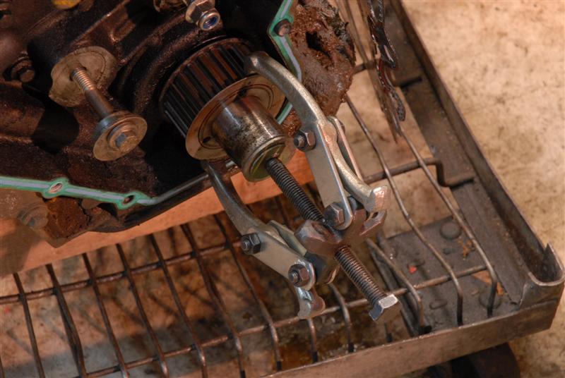 on vire l'outil d'immobilisation, pour le remplacer par un extracteur. Attention aux âmes sensibles: on ne force pas sur la poulie. en fait il s'agit juste de passer les frottements du joints-spi, ainsi que la graisse séchée et/ou la rouille se trouvant entre le vilebrequin et la poulie