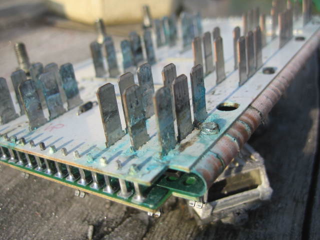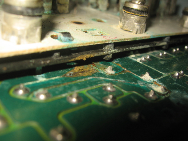 Là c'est plus grave, on peut voir une piste soulevée et coupée, ça a dut chauffé à cause de l'oxydation. Les soudures plus que douteuses engendrant des contacts alèatoires...