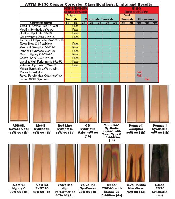 Pour ce qui est des réactions des huiles GL-4 et GL-5 sur les alliages de cuivre (laiton et bronze), il est utilisé le test ASTM D130, comme nous...mais à des températures et un temps de maintient moins sévères. Je reviendrai plus tard sur ce point qui fait couler beaucoup d'encre et laisse apparaître plein de hoax sur la toile.