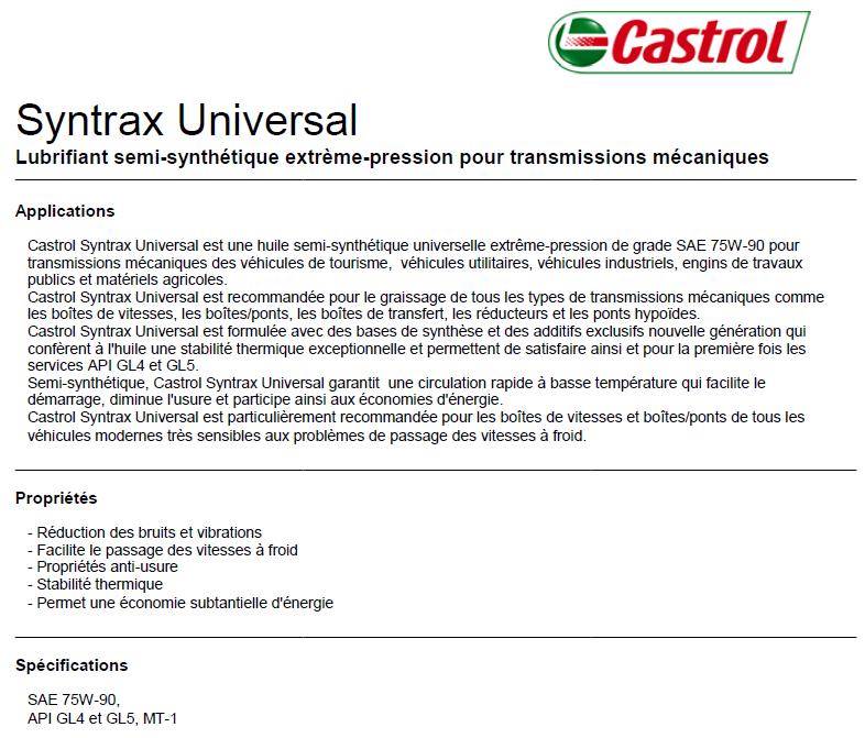 - Castrol Syntrax Universal 75W90 , préconisée par LR pour la LT230. MT-1 pas indiqué sur l'emballage en France