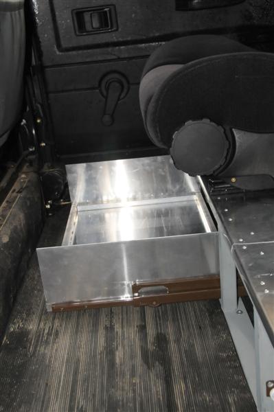 Entre les 2 sièges un cubby-box home-made boulonné sur la structure qui pourra donc céder sa place à un petit frigo si la nécessité s'en fait sentir.