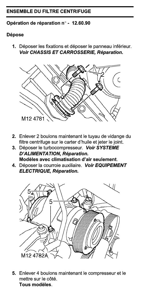 Une fois démontées les durites d'admission d'air et vidangé le circuit de refroidissement, comme tu as la clim, il va falloir que tu enlèves la courroie et que tu démontes les 4 vis de maintien du compresseur de clim. Ensuite, en jouant sur la souplesse des durites il faut déplacer le compresseur pour faciliter l'accès au filtre centrifuge et à la pompe à eau.Il faut déposer le bloc filtre centrifuge et son tube de descente puis démonter les 5 vis du couvercle de la pompe.Enfin, elle peut sortir, tu néttoies les portés de joints avant de remonter la neuve et tu mets une noix de graisse propre sur l'entrainement.