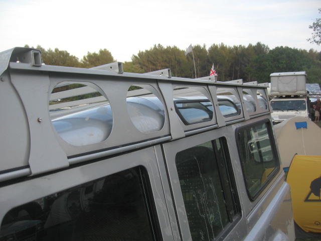 . La photo illustre l'inconvénient qu'aurait un rebord si tu a une tente de toit a accès latérale ce concepts est déjà embêtant car il t'oblige a te trimbaler une échelle qui est toujours située devant la porte que tu souhaite ouvrir, t'oblige a faire l'acrobate pour te déshabiller, et les pompes tu les mets où? Les grosses pompes, pas les sandalettes que tu coince entre la galerie et le toit. Cette galerie est basique, légère, et a passé l'épreuve de 1000km de piste avec 4 points d'ancrage par crapeau seulement.