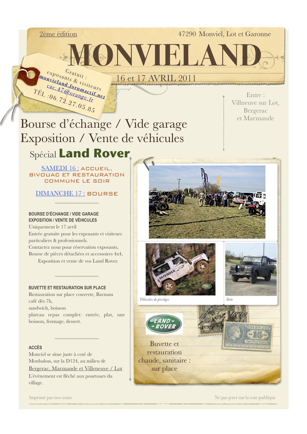 Ce petit message pour vous présenter, Monvieland 2011 pour la 2ème édition, aura lieu le 16 et 17 avril à Monviel 47290 à coté de Cancon dans le Lot et Garonne.