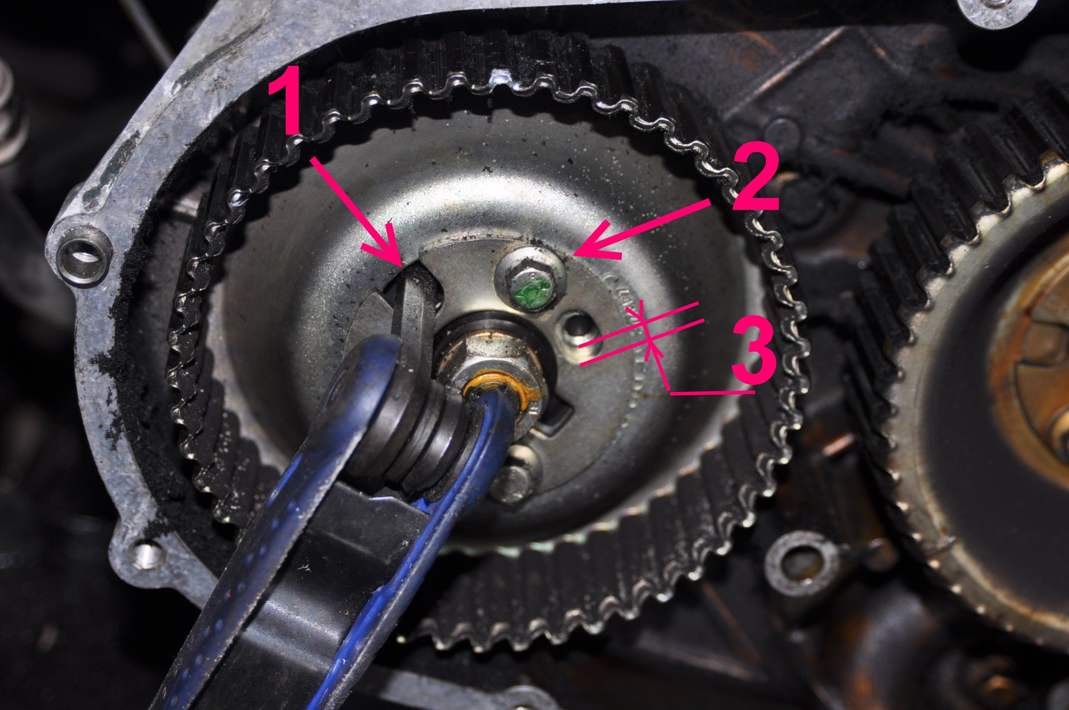 Lors du changement et réglage de la distribution, tu dois normalement aligner le repère qui est sur la poulie de l'arbre à came avec le repère sur le carter. repère 2 sur la photo :