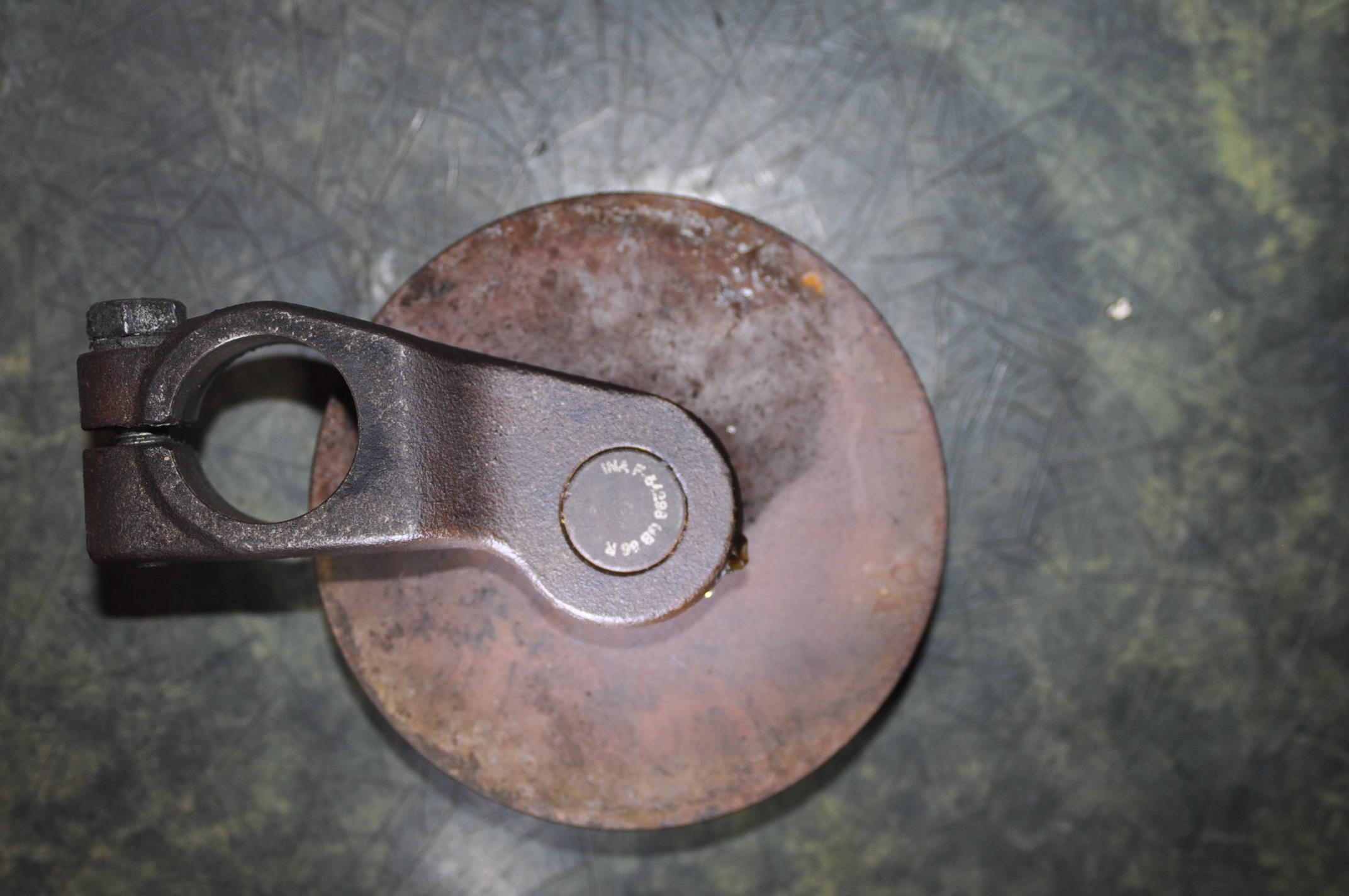 1) Trou de fixation = Ø 25mm. Poulie Ø ext = 92mm . Fond de gorge environ Ø 60mm. 2) Un truc écrit dessus que seul le FBI peut interpréter: INA F 54288 GB 86R 3) Quelques cotes: 4) De face, malgré les apparences ce galet à moins de 12000km. Vis de 13 pour le bridage. NB: Les cotes n'ont pas été prises avec une très grande précision, mais pourront l'être si nécessaire.