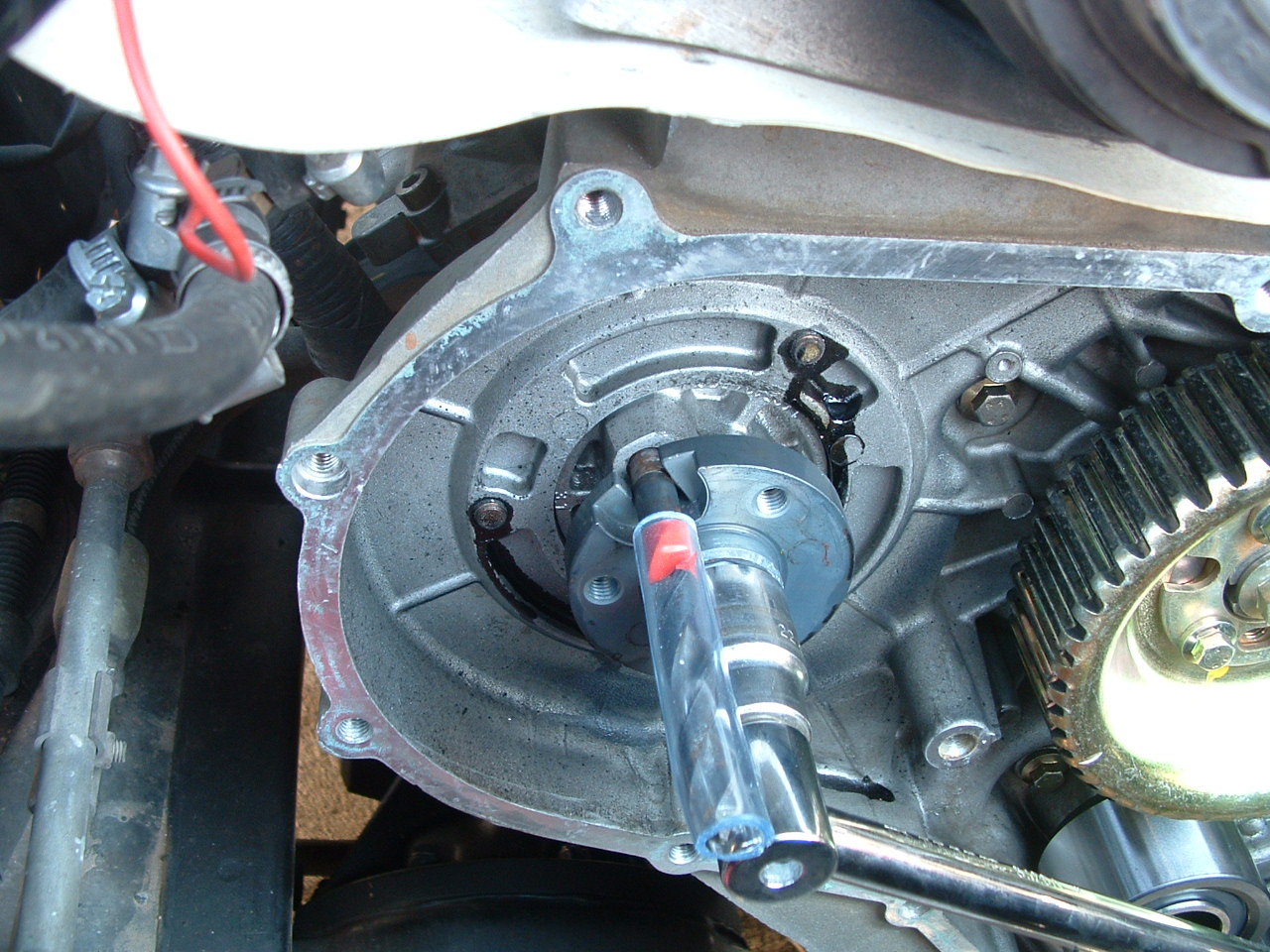 Si c'est la grosse poullie du bas, tu cale la clef sur le longeron, et petit coup de demareur...