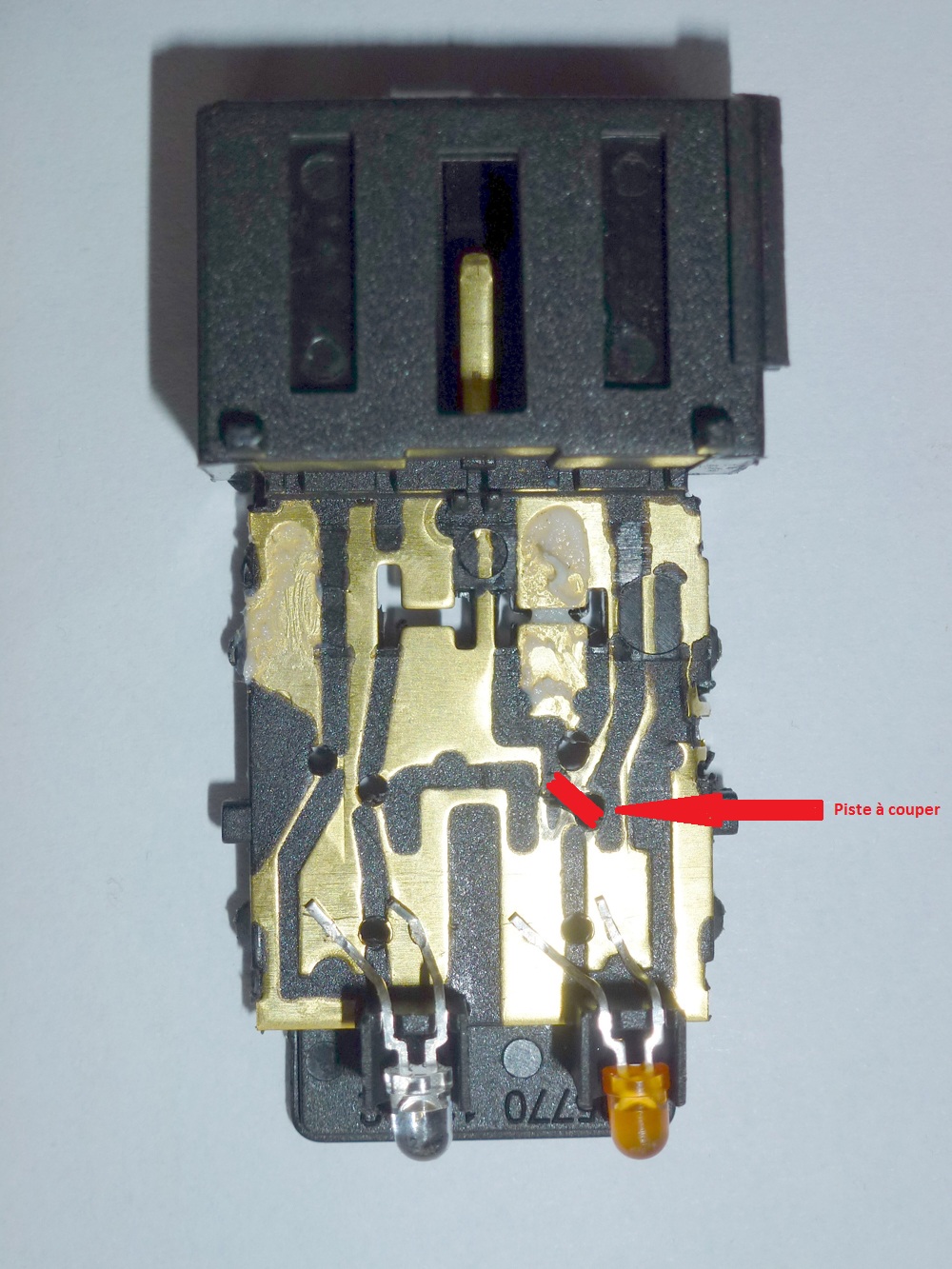 Il faut donc l'ouvrir et le modifier comme montré ci-dessous , en coupant une petite piste en laiton afin d'isoler les pistes 3 et 4 , normalement reliées.