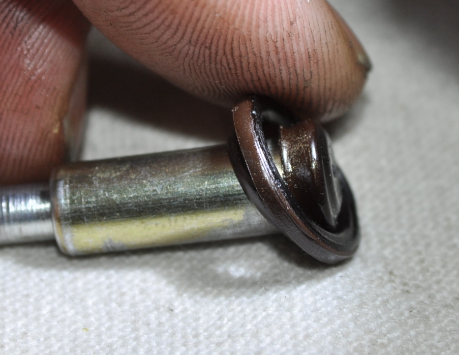 22)Il reste le manchon d'étanchéité (huile de boite)et d'isolation (électrique) (5) qui est à l'origine de la panne me semble-t-il, car il est cuit et déchiré d'où les dépôts sur la pastille. Selon la manière dont s'use le manchon, il peut provoquer une autre panne, en effet si il vient à se détériorer, cela provoque un court circuit franc et fait sauter le fusible du feu de recule, d'abord une fois de temps en temps, puis de plus en plus souvent et enfin a chaque fois que l'on passe la marche arrière. Car c'est un + 12V après contact qui est commuté pour allumer le feu de recule.