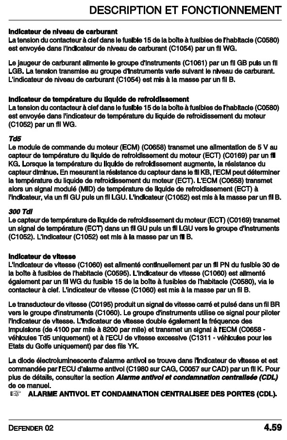 Pourtant le cable qui part de l'indicateur est on ne plus rigidebisnouk a écrit :S'il y a coupure brutale de l'indicateur de vitesse alors il s'agit d'un modèle à transcodeur... donc d'un 300Tdi pré-TD5 (fusible n°12 - transducteur de vitesse)