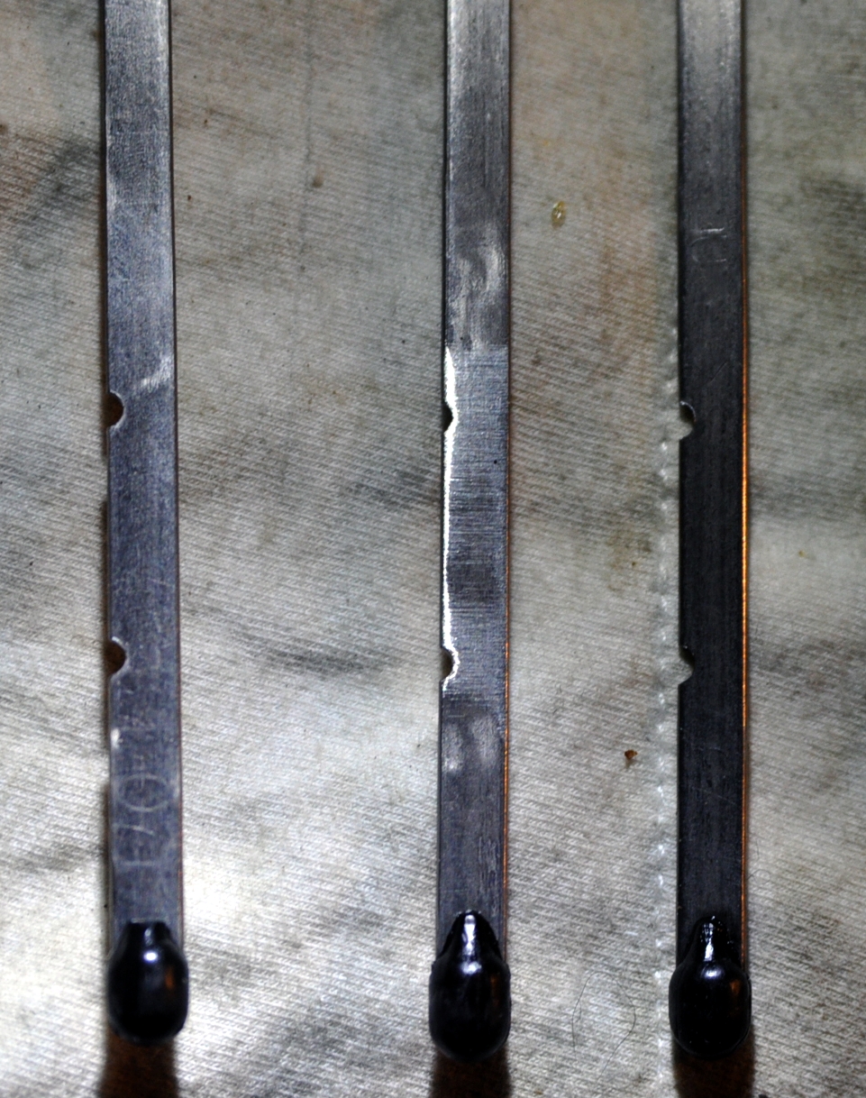 Je penche maintenant (certains diront qu'ils le pensent depuis le début, c'est vrai...) pour une trace de meulage de la jauge... C'est en effet possiblement cohérent avec la précence à cet endroit des "crans-repères" réalisé par "poinconnage", ce qui laisse des bavures en forme de "fil" sur le bord de la jauge...