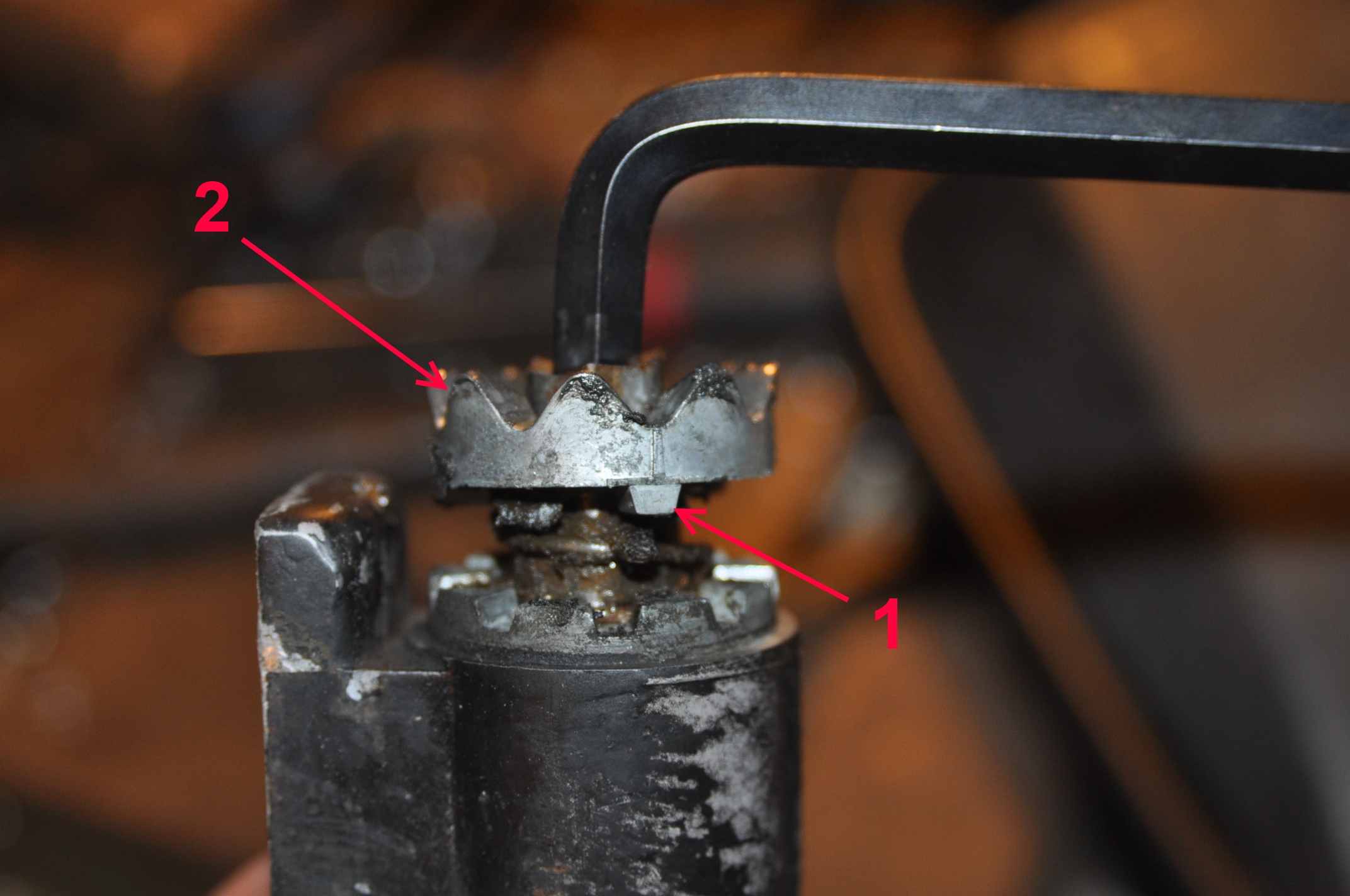 8 ) Correspondance dans le bras du verrouillage 2 mobile du haut de la couronne avec le bras. Le blocage en rotation 1 de la couronne ne bouge pas, ou disons que je ne l'ai pas vue bouger lors des diverses manipulations, on peut le voir photo 6. Alors qu'il est clair que l'on tire bien sur le gros ressort lorsque l'on passe d'une position à l'autre en tirant sur le bras. On peut voir une usure sur le haut de la couronne et le bras, mais pas sur le blocage 1 . Donc je ne m'explique pas bien la présence de ce deuxième petit ressort, puisque le gros ressort plaque en permanence la couronne sur sur le corps en tirant sur le bras.