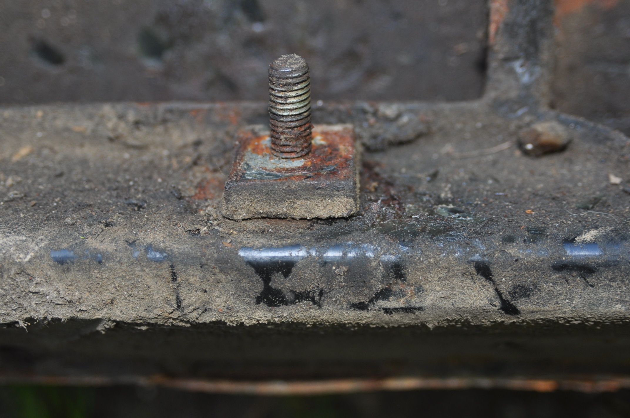 Donc récupération de la vis , non sans mal, car bien oxydée. Puis réalisation d'une patte plus long pour un blocage sur le bord intérieur de la traverse neuve. Soudure de la patte sur le carré soudé d'origine sous la tête de la vis, et mise en place sur la traverse neuve avec le carré fileté d'origine comme écrou de fixation. Car oui, on peut en passant les doigts sentir le système de blocage, mais clairement, tend que je n'avais pas vue le système, je ne comprenais pas pourquoi cela tournait et comment s'était fait.