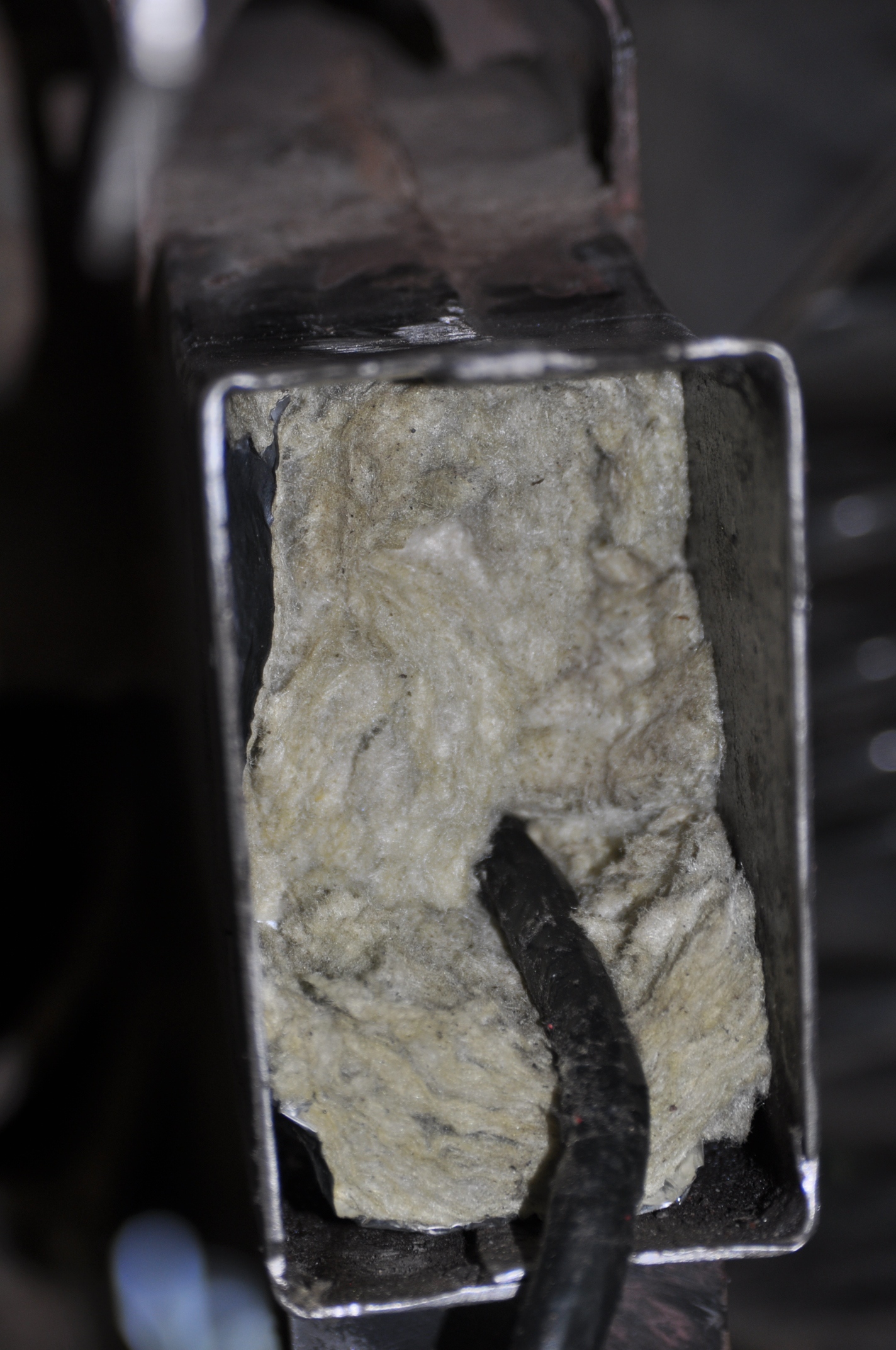 Troisième coupe: Prévoir une protection qu'utilisent les plombiers, pour souder au chalumeau à base d'alu et anciennement d'amiante ( pare flamme ) dans lequel tu enrouleras le faisceau à l'endroit de la soudure, et qui restera prisonnier dans le longeron après soudure. Ici de la laine de roche pour caisson de cheminée.