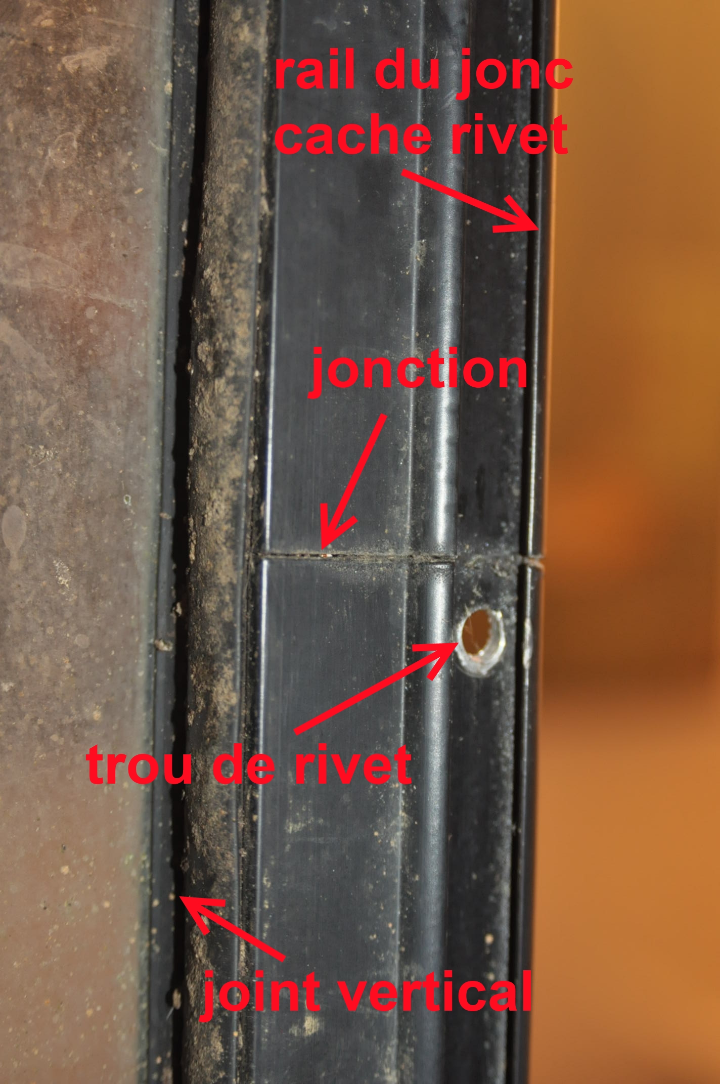 1) Fenêtre sans le bâti. 2)Jonc cache rivet: 3)Avec un petit tournevis, il faut le soulever et le tirer délicatement pour le dégager de son logement. Le bâti complet s'enlève par l'extérieur, une fois que tu as percé tous les rivets.