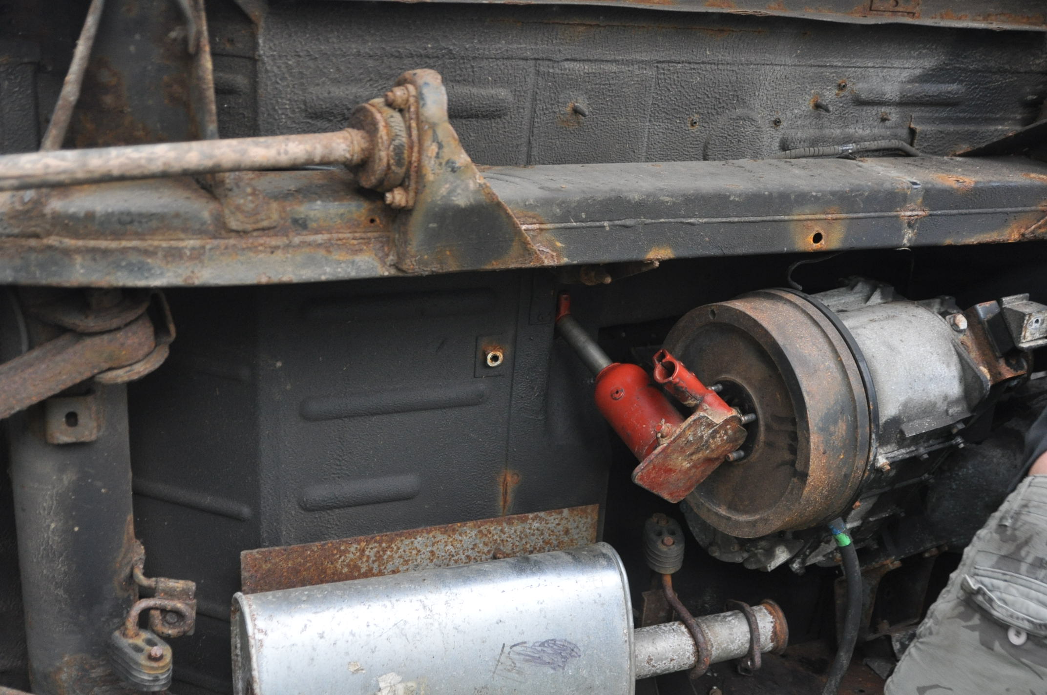Un moteur de 300 sur un disco, cela se sort à la disqueuse. Tu coupes les pattes du capot, tu mets le disco sur le coté, tu défais le tour de boite en poussant sur la boite avec un cric bouteille cela facilite l’accès au vis et aux écrous voir photo , les 2 écrous des silenblocs support moteur ceux du dessous, pratique vue la position, un coup de disqueuse sur la descente d’échappement et tu retournes de disco sur le toit, puis tu contrôles la descente en coupant au fur et à mesure à la pince coupante, ou à la disqueuse, tout ce qui s'oppose descente. Ainsi, c'est beaucoup plus simple d'enlever le viscocoupleur avec les trois palles restantes du ventilateur . Penses à disquer aussi les pattes de fixation moteur soudées au châssis, ce ne sont pas les mêmes sur un land 2,5D . Détail du positionnement du cric pour faciliter le déboulonnage du tour de boite.
