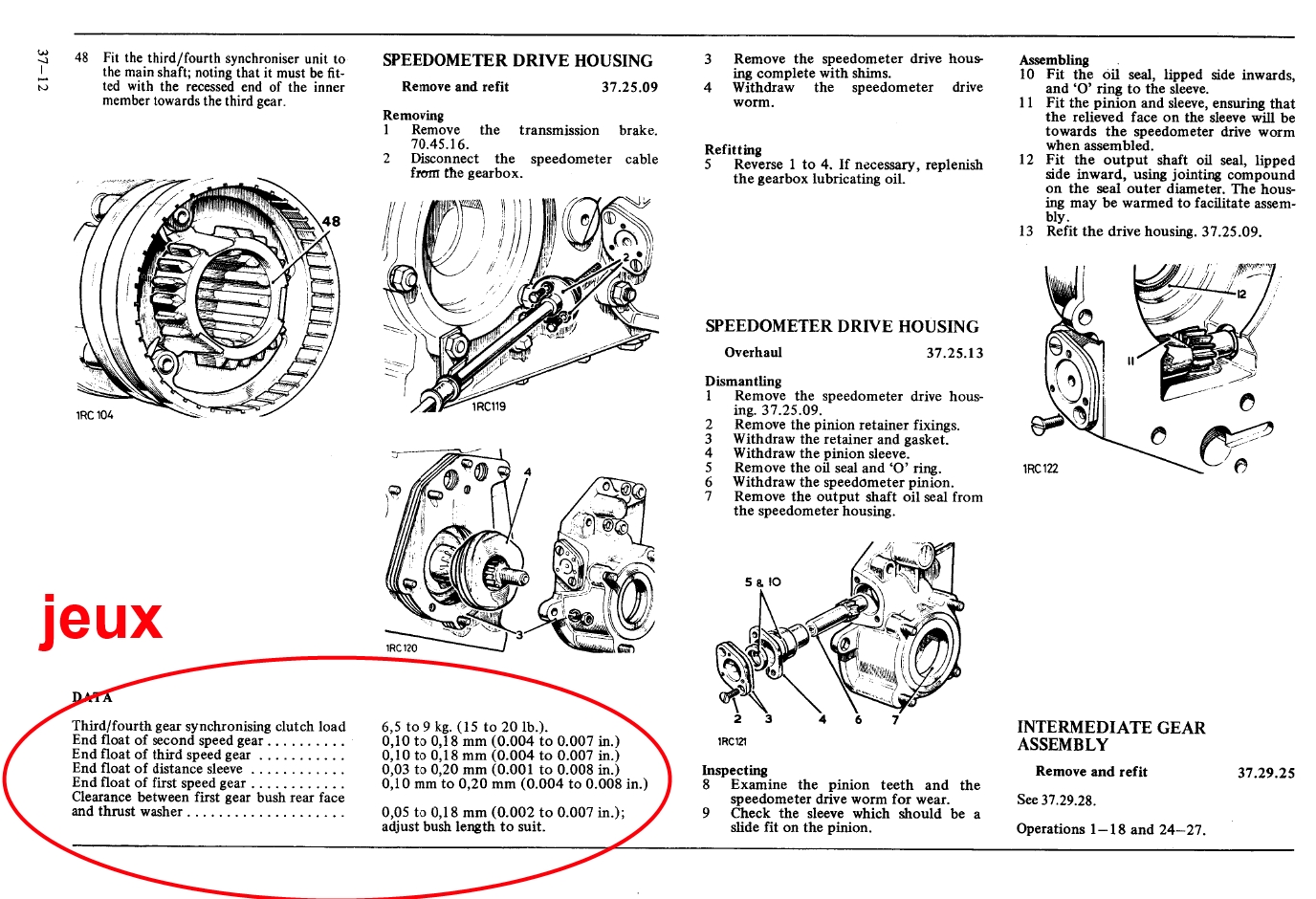Regarde le manuel d'atelier, il y a les jeux à contrôler clairement identifier: D'autre part, je crois me rappeler, que sous le pignon de 3, il y a un roulement à aiguille avec cage en plastique, si le phénomène n'est que en 3, il est possible qu'il y ai que lui en cause. Mais de toute façon, si tu dois ouvrir ta boite, alors change ce roulement à titre préventif même si ce n'est pas lui, c'était un des points faible de cette boite, il ne coute pas chère.