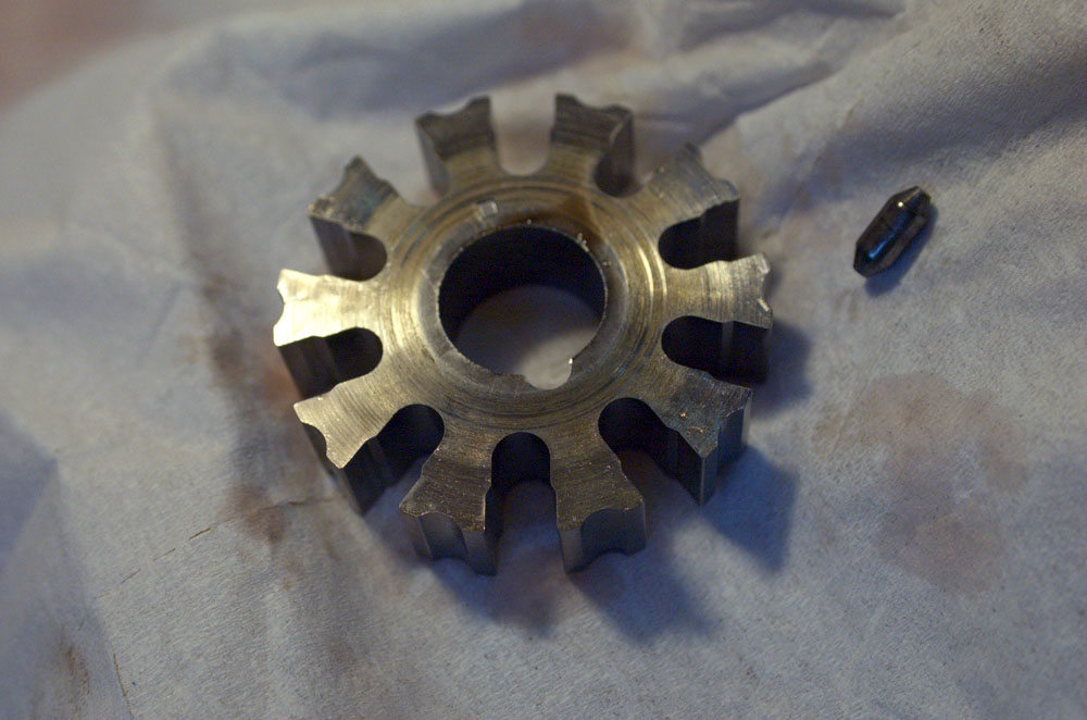 ma pièce de couplage des pompes DA et refroidissement était bien usée, un gros mm de matière en mois sur le bord d'attaque. C'était monté sec, j'ai remonté graissé.