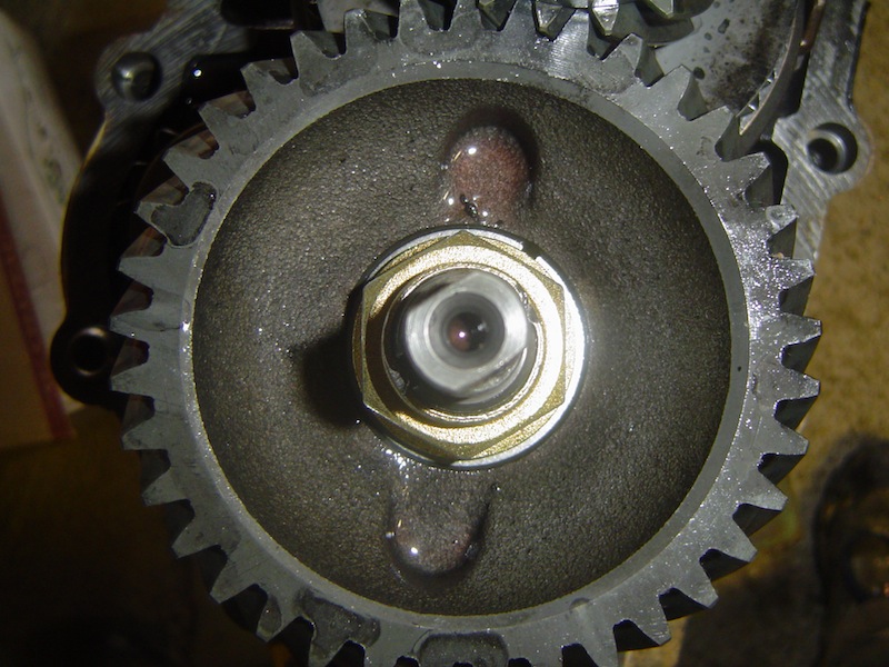 Juste en dessous, on trouve l'écrou de maintien du pignon de 5° de l'arbre secondaire. Notez les 2 creux dans le pignon ainsi que les méplats chargés d'entrainer la pompe à huile.