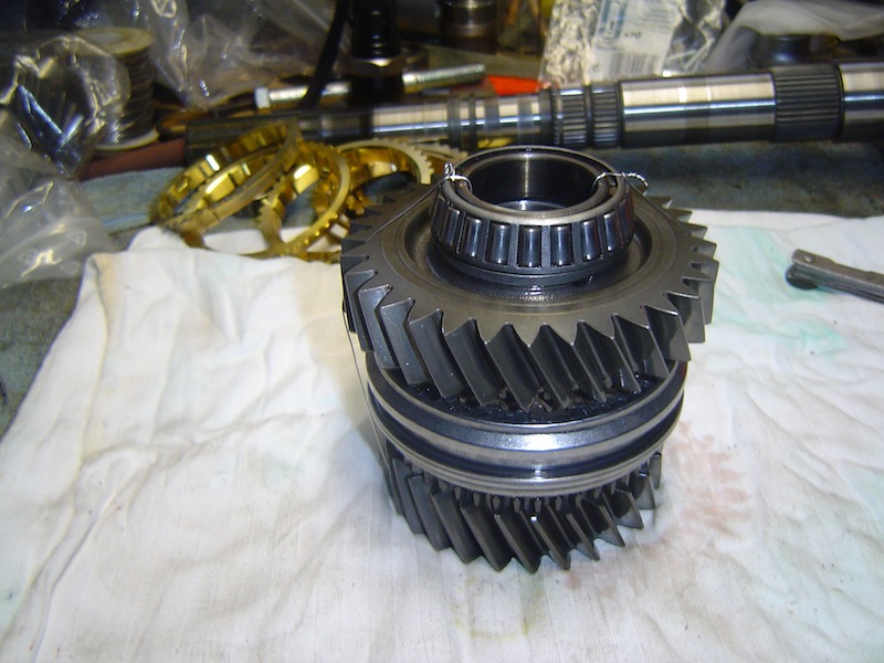 On attaque par le remontage sur l'arbre de sortie du pignon de 3° avec le synchro 3°/4° et le roulement pilote.