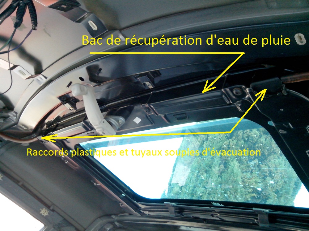 Premier problème: Il arrive que la vitre plaque mal sur le joint, dans ce cas, ça déborde à l’intérieur par-dessus le joint. <br />Deuxième problème: l'eau s'infiltre entre le cadre et la tôle du pavillon :<br />1)	Si les tuyaux sont propres et pas pincés quelque part, pas de problème, l’eau est évacuée à l’extérieur.<br />2)	Dans le cas contraire, l'eau ne s'écoule pas assez vite et la gouttière déborde au niveau de la manivelle de commande ou dans le ciel de toit….