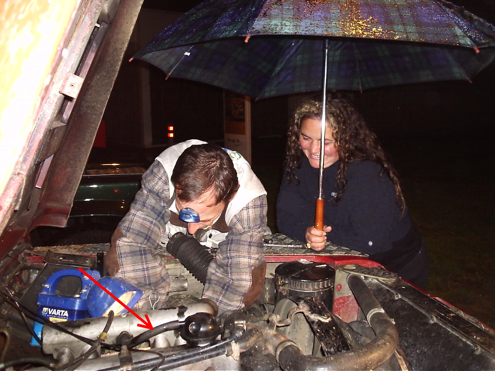 Je n’ perdais pas au chang’, pardi ! Donc plus clairement un T sur la durite repéré par la flèche bleu, et le bas moteur.