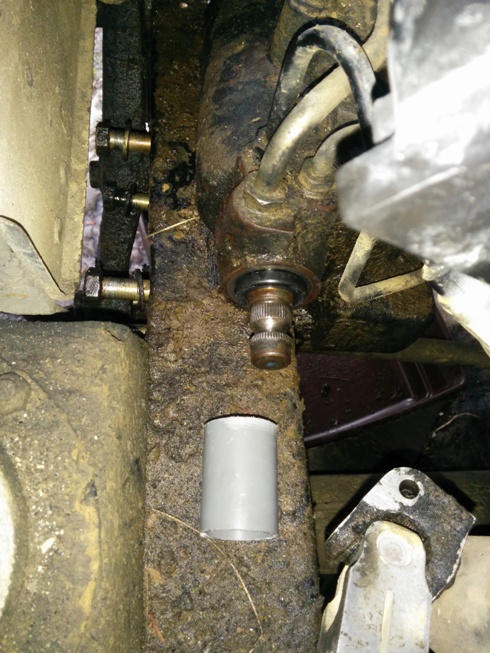 6- Remonter un joint neuf après l'avoir huilé. J'ai utilisé un bout de tuyau PVC d'évacuation de lavabo de 32mm de diam et 50mm de long pour pousser le joint sans risquer d'abimer l'arbre (voir photo). 7- Tout remonter à l'inverse. Attention, pas forcément évident d'aligner les trous du chassis avec ceux du boitier. Pour ma part, j'avais laissé la roue droite à terre pour éviter que l'arbre d'entrée du boitier tourne et que je perde la position. Du coup, il n'a pas