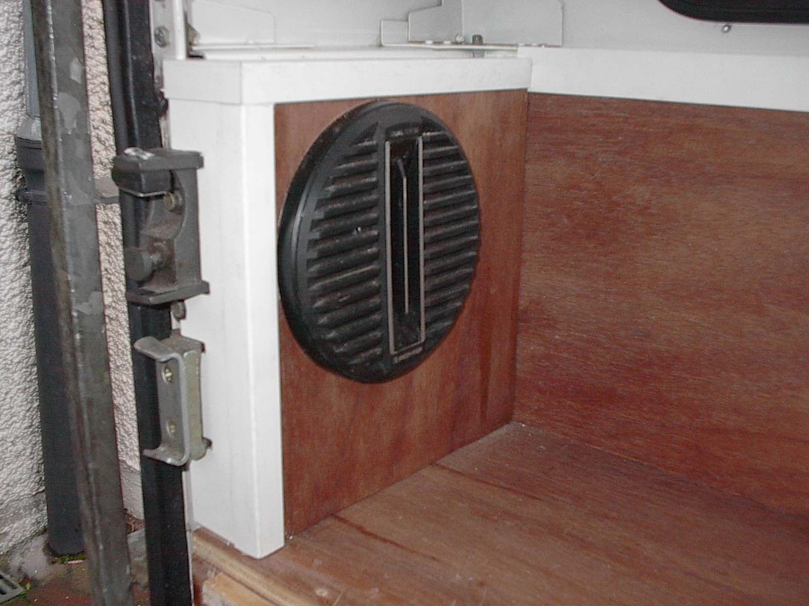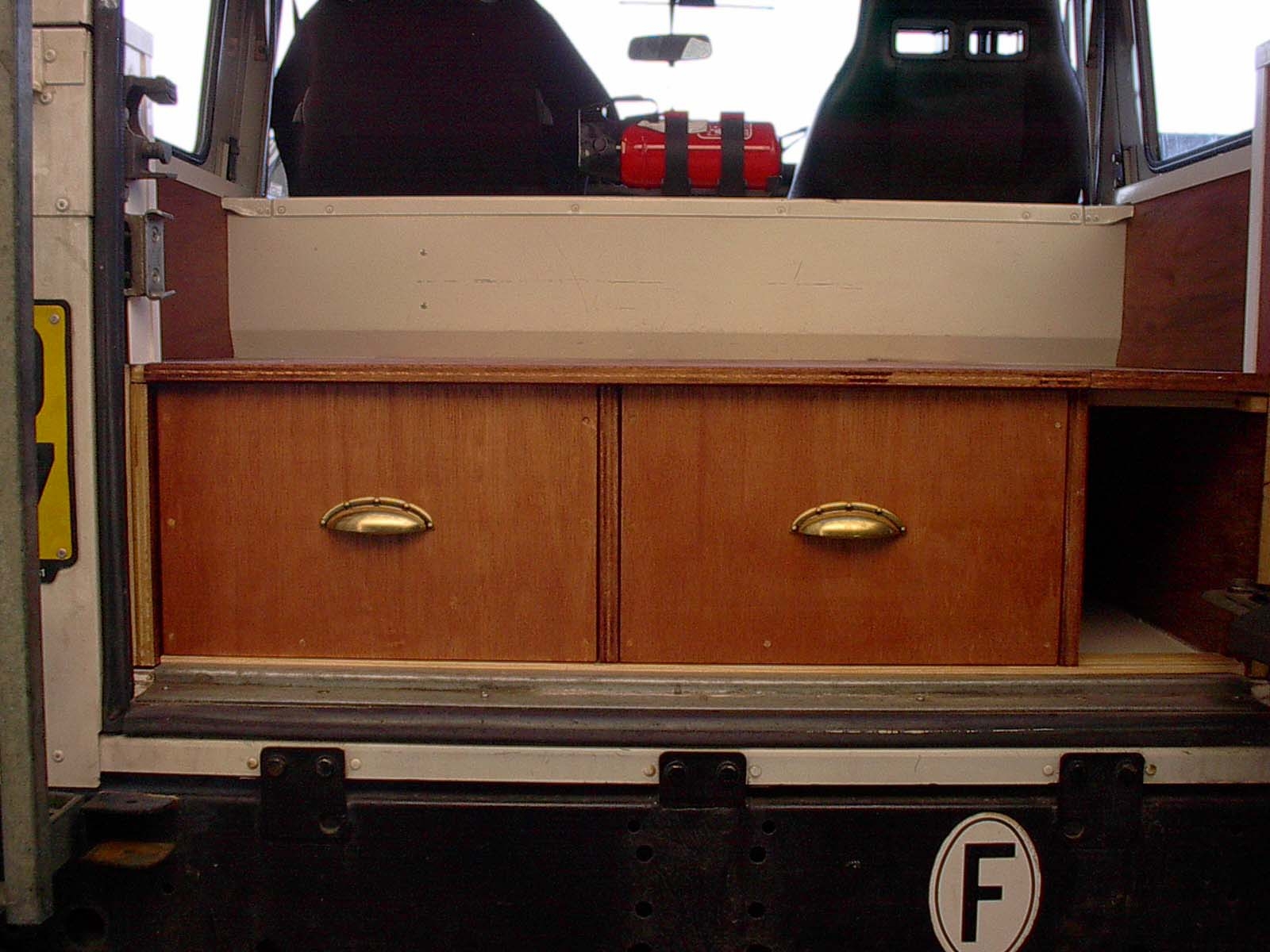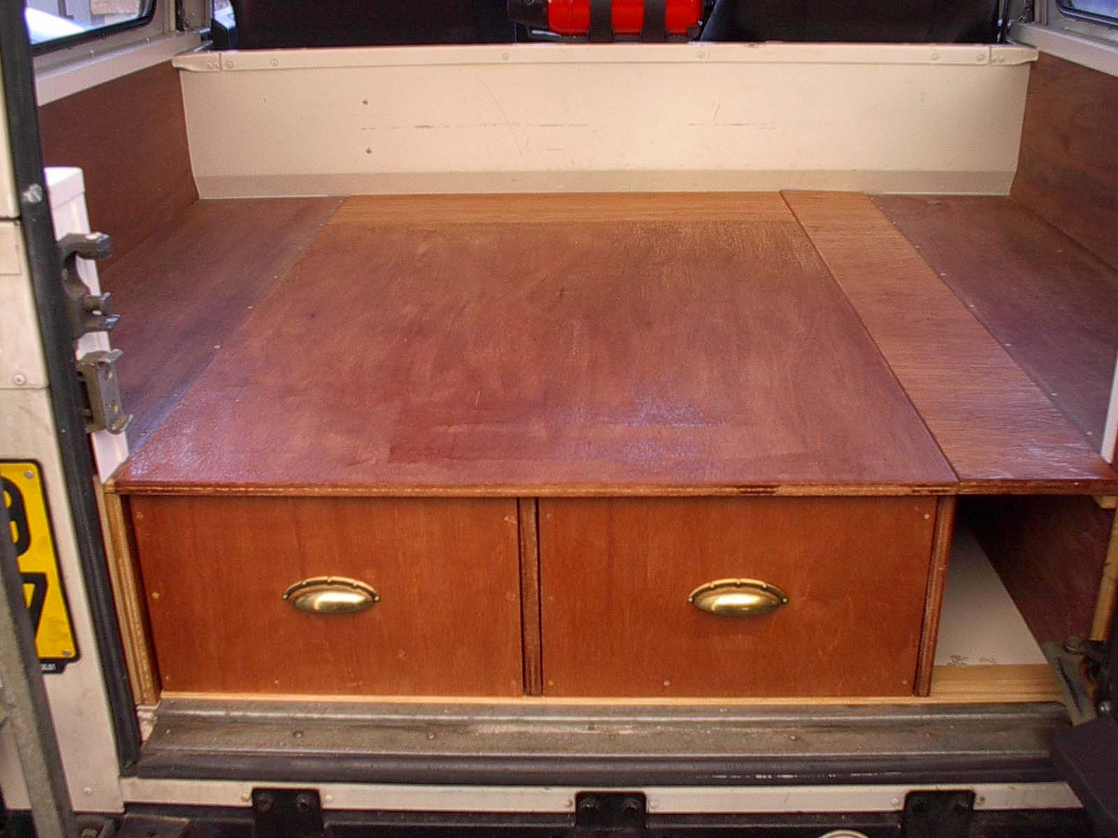 Sous ce plancher, j'ai fait un grand tiroir cloisonné qui tient toute la place dispo. entre les passages de roues, et roule sur le fond de benne grace à des roulettes genre magasin de bricolage. Le freinage du tiroir se fait grace à un arretoir de porte.